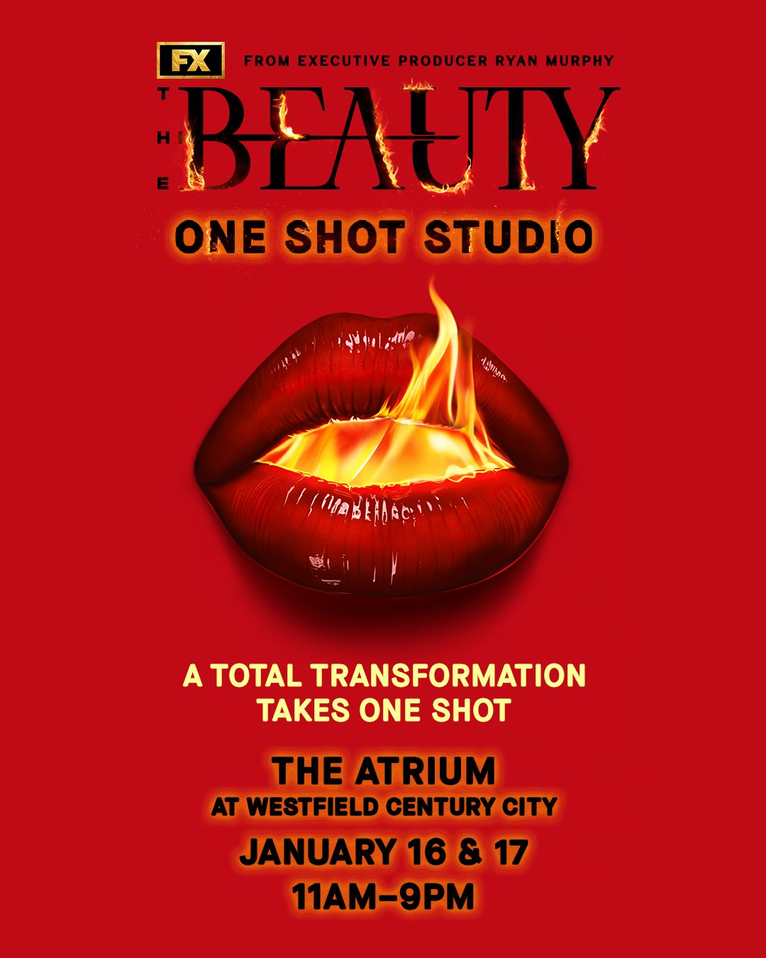 - Check out FX's The Beauty One Shot Studio for yourself at Westfield Century City on Friday, January 16th and Saturday, January 17th from 11:00 a.m. to 9:00 p.m.