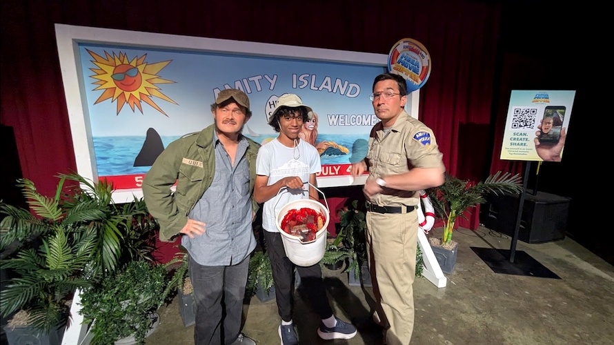 Last Friday, exactly 50 years after Jaws first made audiences afraid of the water, Laughing Place was invited to a special anniversary screening at the Alamo Drafthouse in Downtown Los Angeles. I attended with my Jaws ride-obsessed teenage son, Gideon. What followed was an evening of fun, fandom, and film that honored the movie that literally created the summer blockbuster.