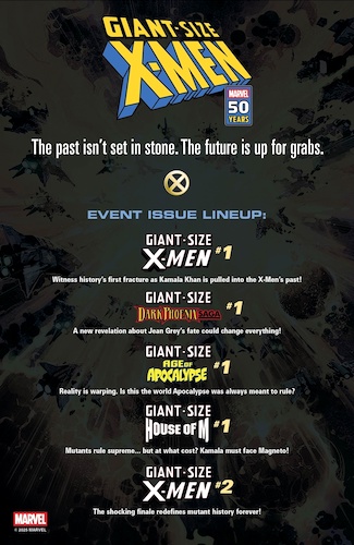 - The event sees Ms. Marvel pulled into the distant past by an unstable and unleashed Legion. Locked in a battle through time against the Omega-Level mutant, Kamala Khan is the only one standing in the way of X-Men history being warped forever! Following Giant Size X-Men #1, and Giant-Size Dark Phoenix #1, Kamala finds herself stuck in the darkest future of all in Giant-Size Age of Apocalypse #1. Worse yet: It’s only hours from its inevitable end; if Kamala can’t find what’s left of the X-Men, she’ll burn in nuclear hellfire. Former enemies must learn to rely on one another as they journey through a land of charred bones and broken promises...but can Legion truly be trusted? And how far will Rogue go to teach Kamala the true meaning of mutant identity? Welcome back to the Age of Apocalypse – where no one survives the experience.
