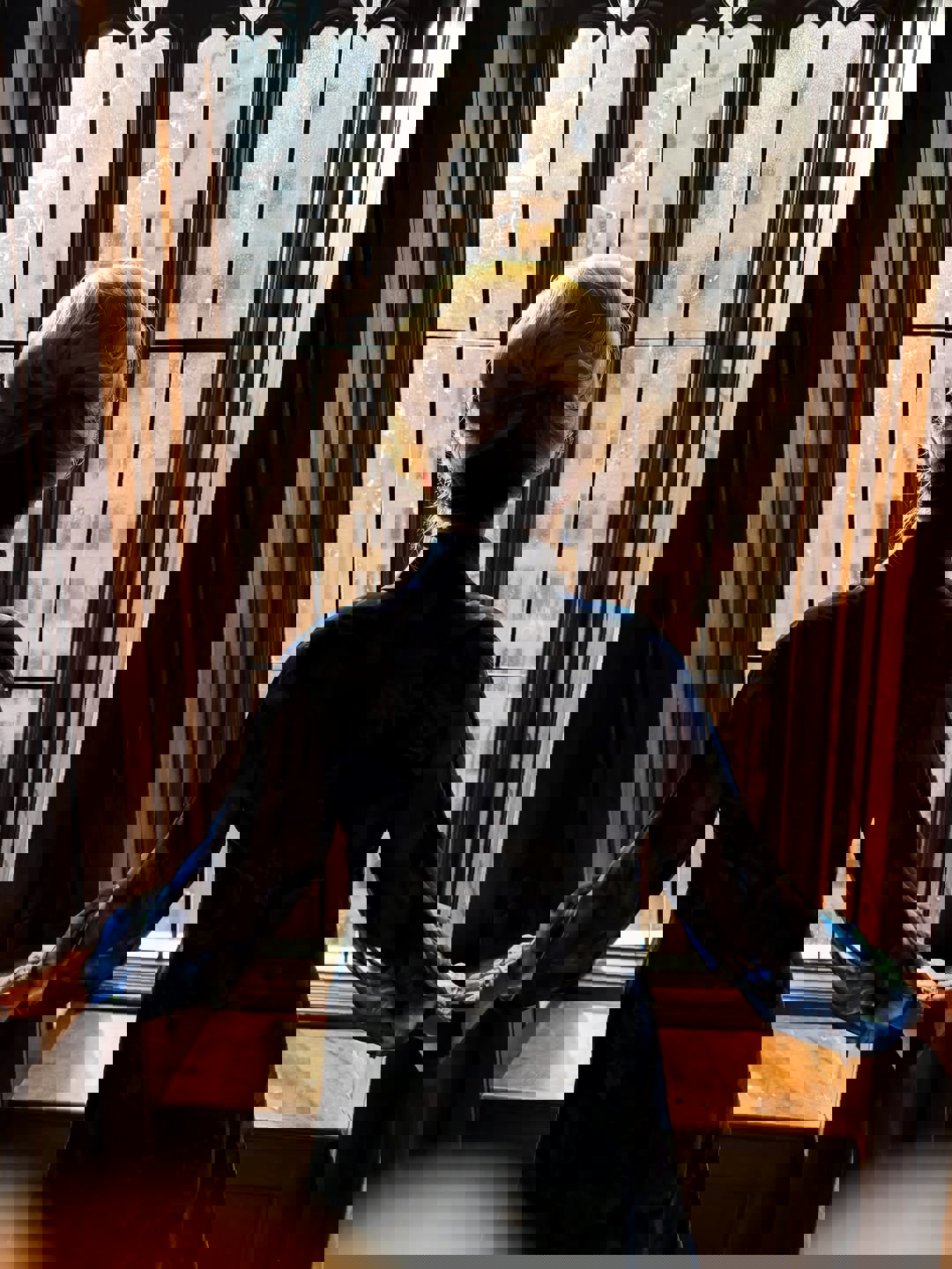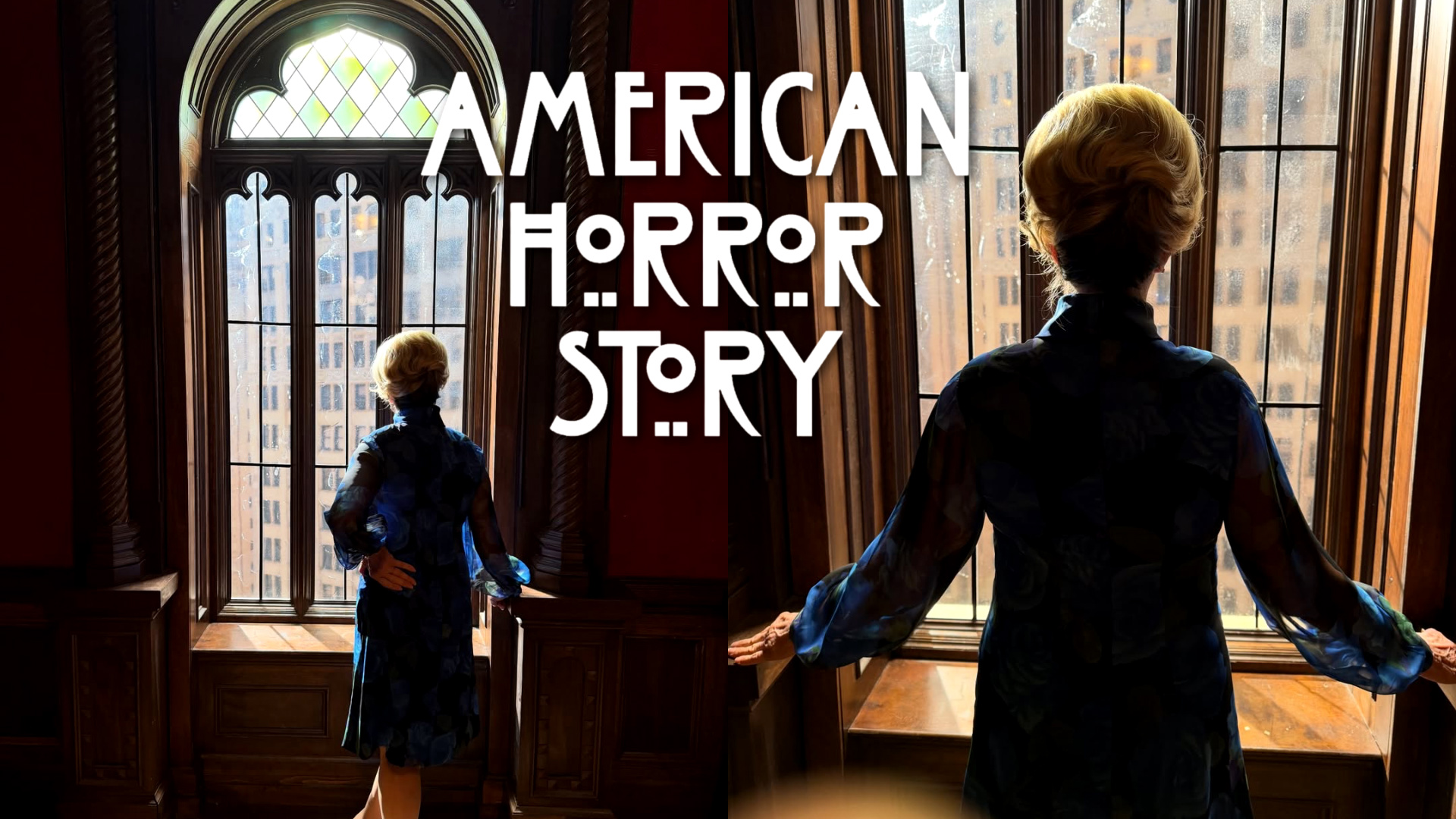 - Each of the three images show Jessica Lange peering out of an old window, wearing a blue dress and heels – eerily similar to what her character Constance previously wore in seasons 1 and 8.