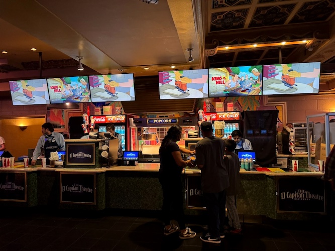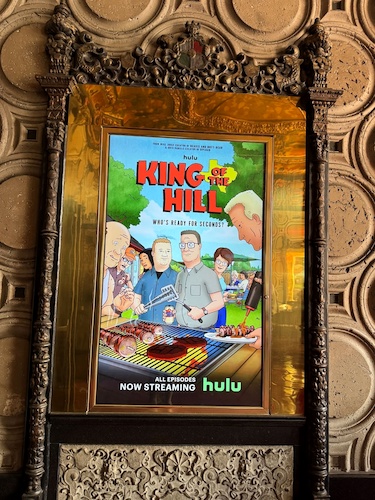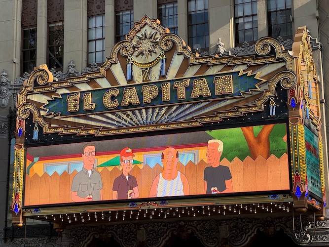 Rewinding time about an hour and a half, I arrived at El Capitan Theatre to find the famous Hollywood movie house’s marquee, lobby, and concession stand decked out in the King of the Hill revival’s key art.
