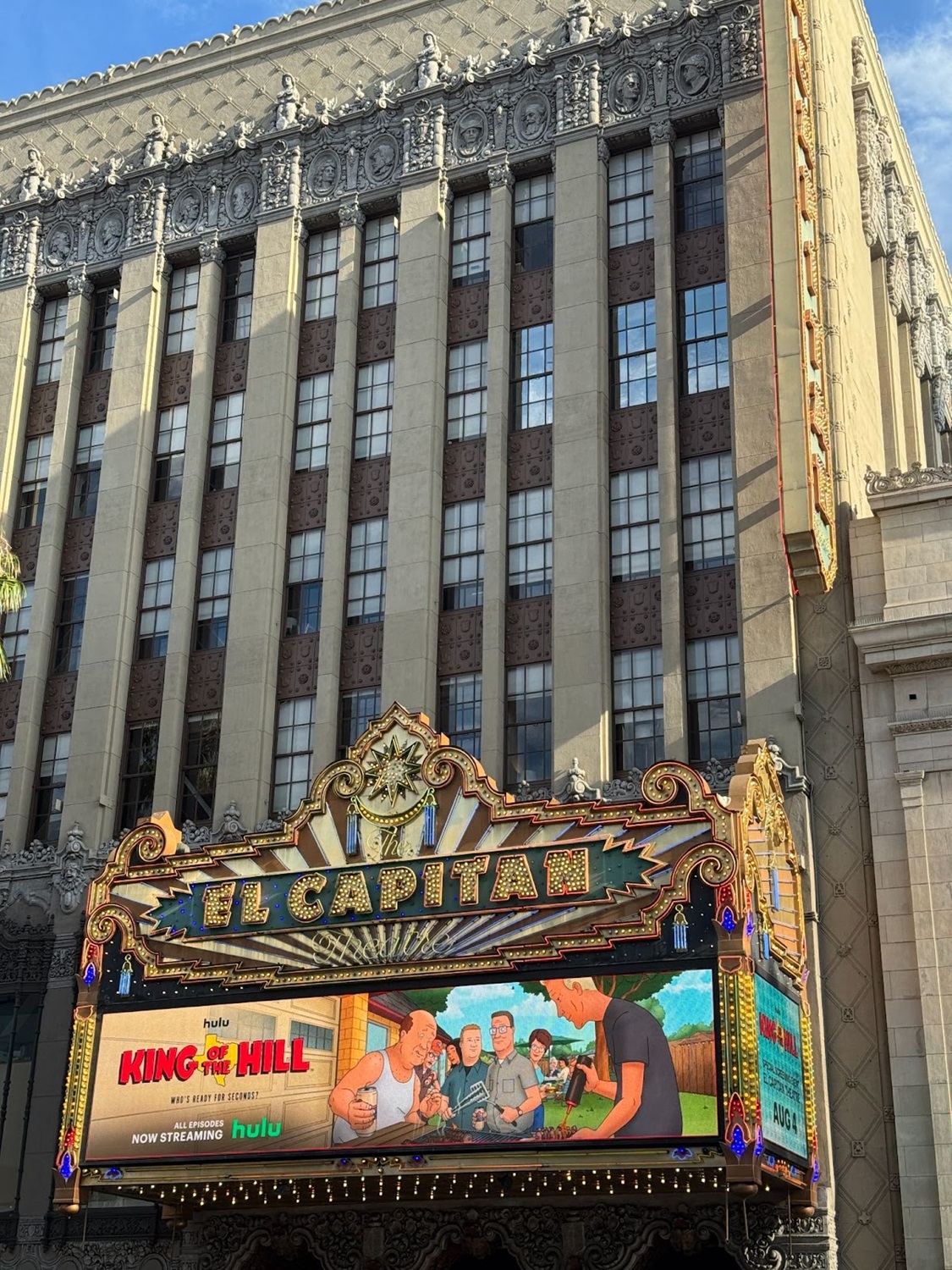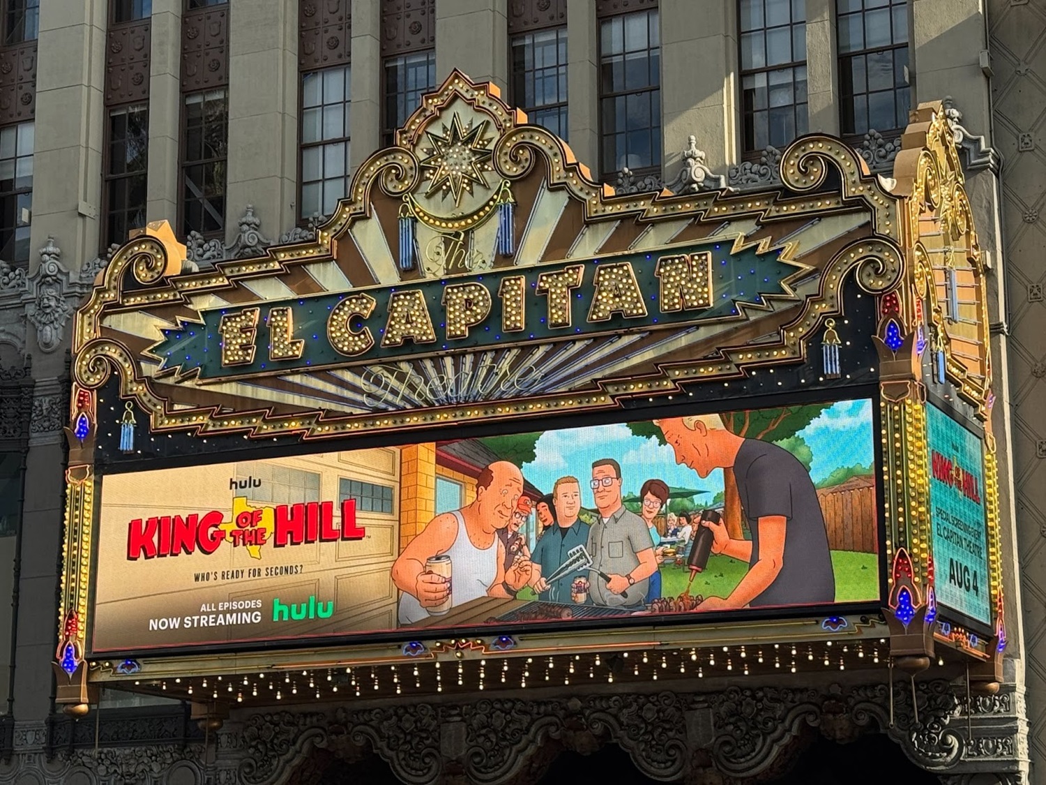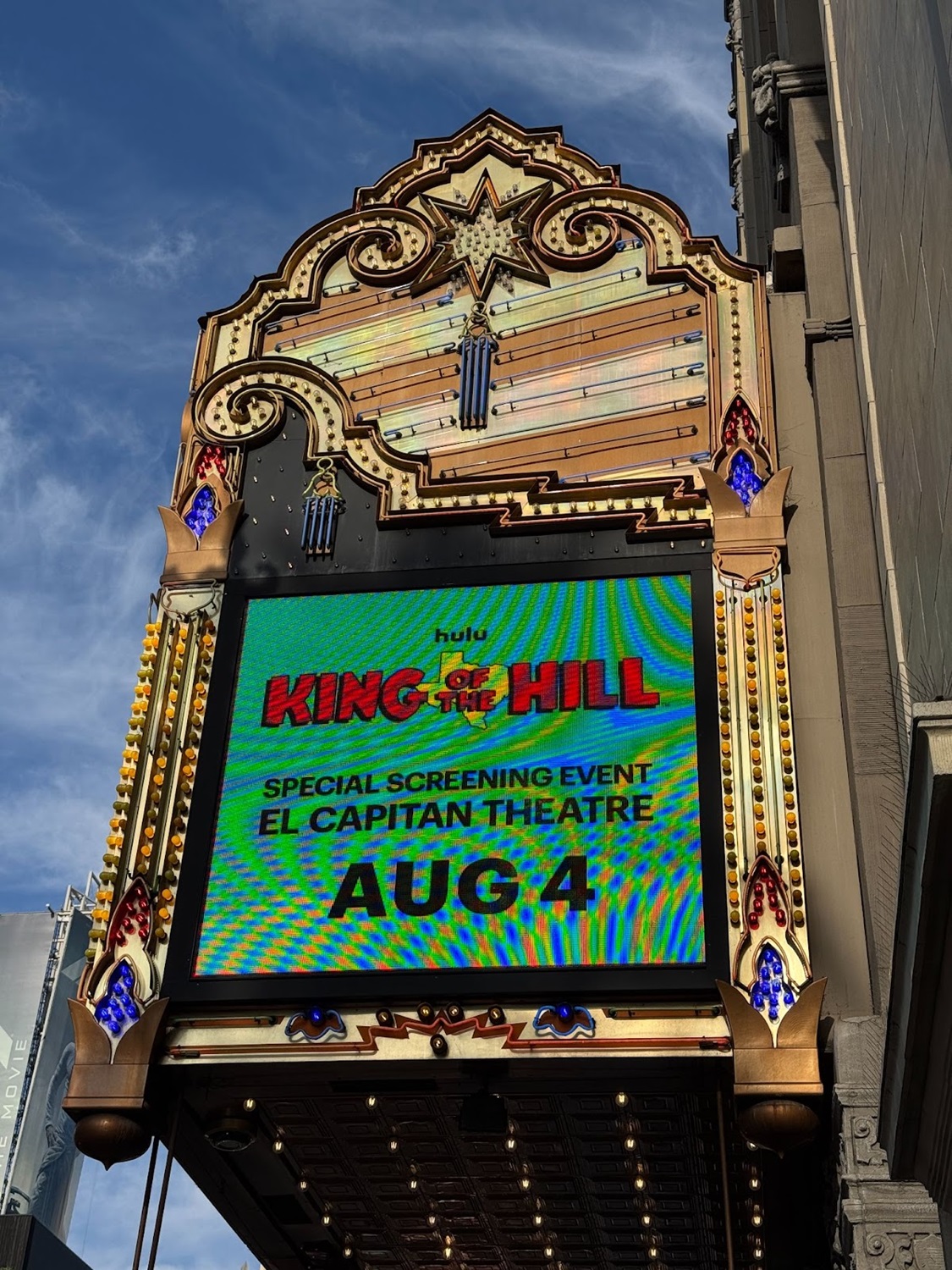 Rewinding time about an hour and a half, I arrived at El Capitan Theatre to find the famous Hollywood movie house’s marquee, lobby, and concession stand decked out in the King of the Hill revival’s key art.