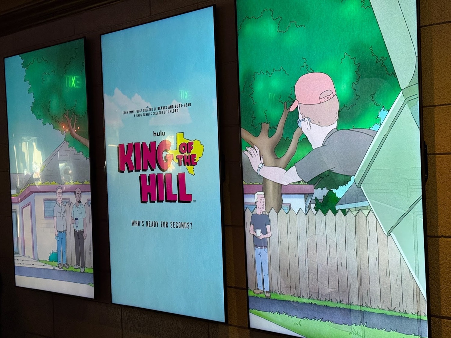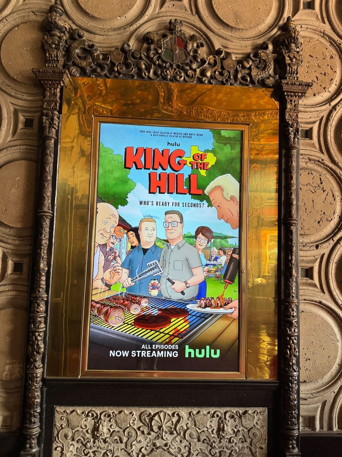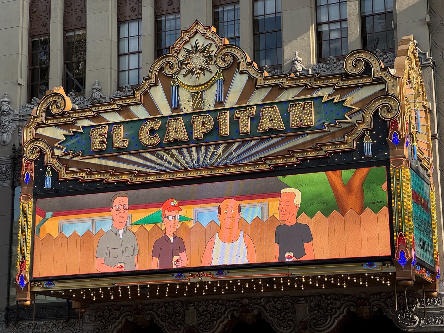 Rewinding time about an hour and a half, I arrived at El Capitan Theatre to find the famous Hollywood movie house’s marquee, lobby, and concession stand decked out in the King of the Hill revival’s key art.