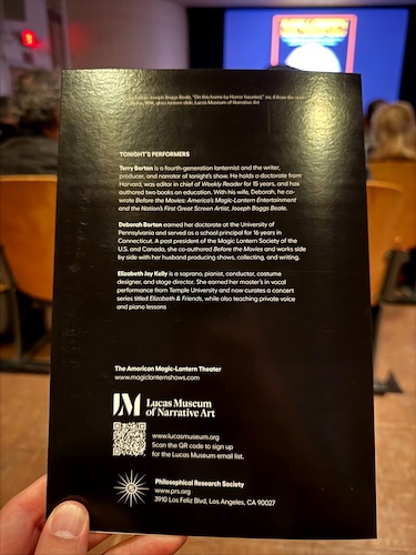 The audience at the Philosophical Research Society was enthralled by the magic-lantern show that evening, and afterwards Borton even stuck around for a Q&A session during which we learned a lot more about the history of the technology and art form. Personally I got a really big kick out of this two-hour event, and I can’t wait to attend more like it– either at other venues around Los Angeles or at the Lucas Museum itself starting next year.