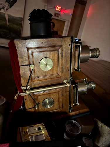 The following photo is an up-close look at the magic lantern used by Terry Borton during the show, which utilizes slides made of transparent plates to project images on the screen. The dual lenses allow the lanternist to actually animate the and transition between the images. In-between the stories listed above, Borton (with the assistance of his wife Deborah and a talented pianist and singer named Elizabeth Joy Kelly) incorporated a number of other short stories, songs, and effects– such as the fabled horror-themed Phantasmagoria– that were illuminated by the magic lantern and many wonderfully illustrated slides created by the artist Joseph Boggs Beale more than a century ago.