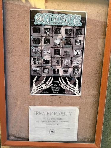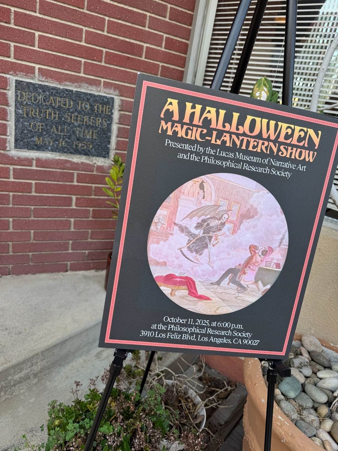 Upon entering the courtyard of the Philosophical Research Society, we found signage promoting the “Victorian Halloween" Magic-Lantern Show, and we also took a look around the venue’s library and gift show, which was full of all sorts of interesting materials on an eclectic variety of subjects. There was also a calendar of events posted for October.