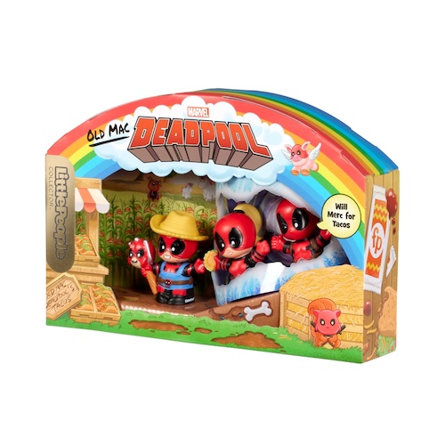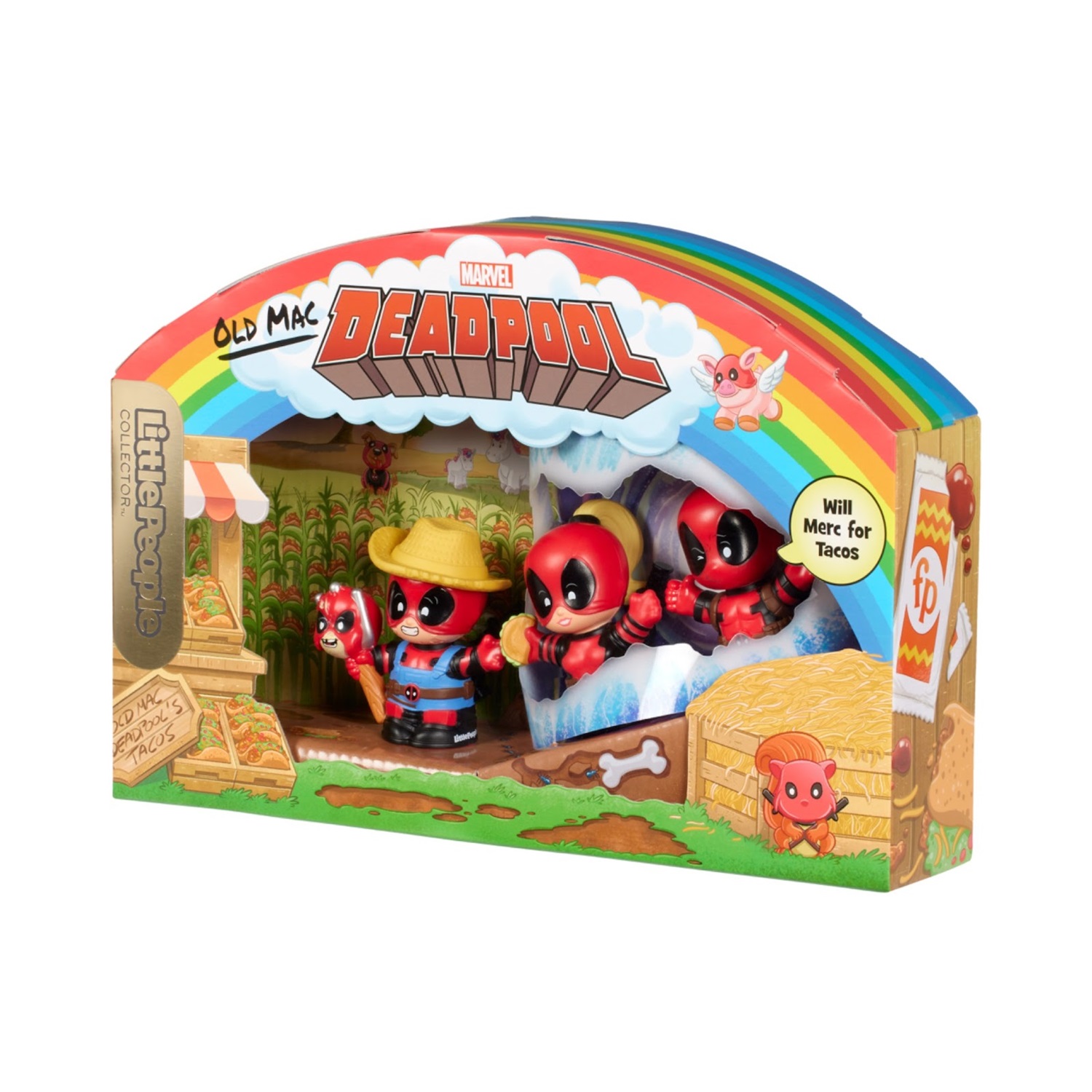 - Brace yourself for chaos, chimichangas, and crops — Deadpool’s hitting the countryside! This Comic-Con 2025 collectible takes the Merc with a Mouth on an unexpected detour to a taco-fueled farm universe. For the first time, he’s swapping back alleys for barnyards in a laugh-out-loud adventure like no other. Featuring a reimagined Super Hero and packed inside a whimsically wild, rainbow-shaped box, this set is bursting with bold artwork and flavor. It’s Deadpool, dialed up to 11, with friends, food, and full-on farmyard mayhem.