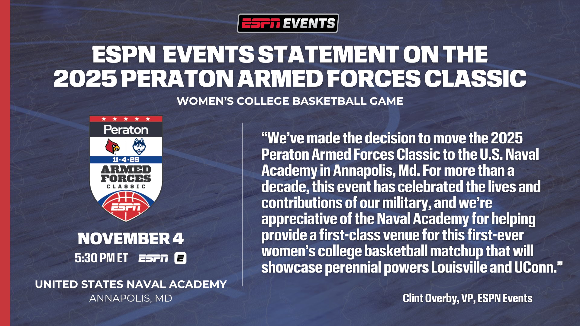 - Clint Overby, VP, ESPN Events: "We've made the decision to move the 2025 Peraton Armed Forces Classic to the U.S. Naval Academy in Annapolis, Md. For more than a decade, this event has celebrated the lives and contributions of our military, and we're appreciative of the Naval Academy for helping provide a first-class venue for this first-ever women's college basketball matchup that will showcase perennial powers Louisville and UConn."