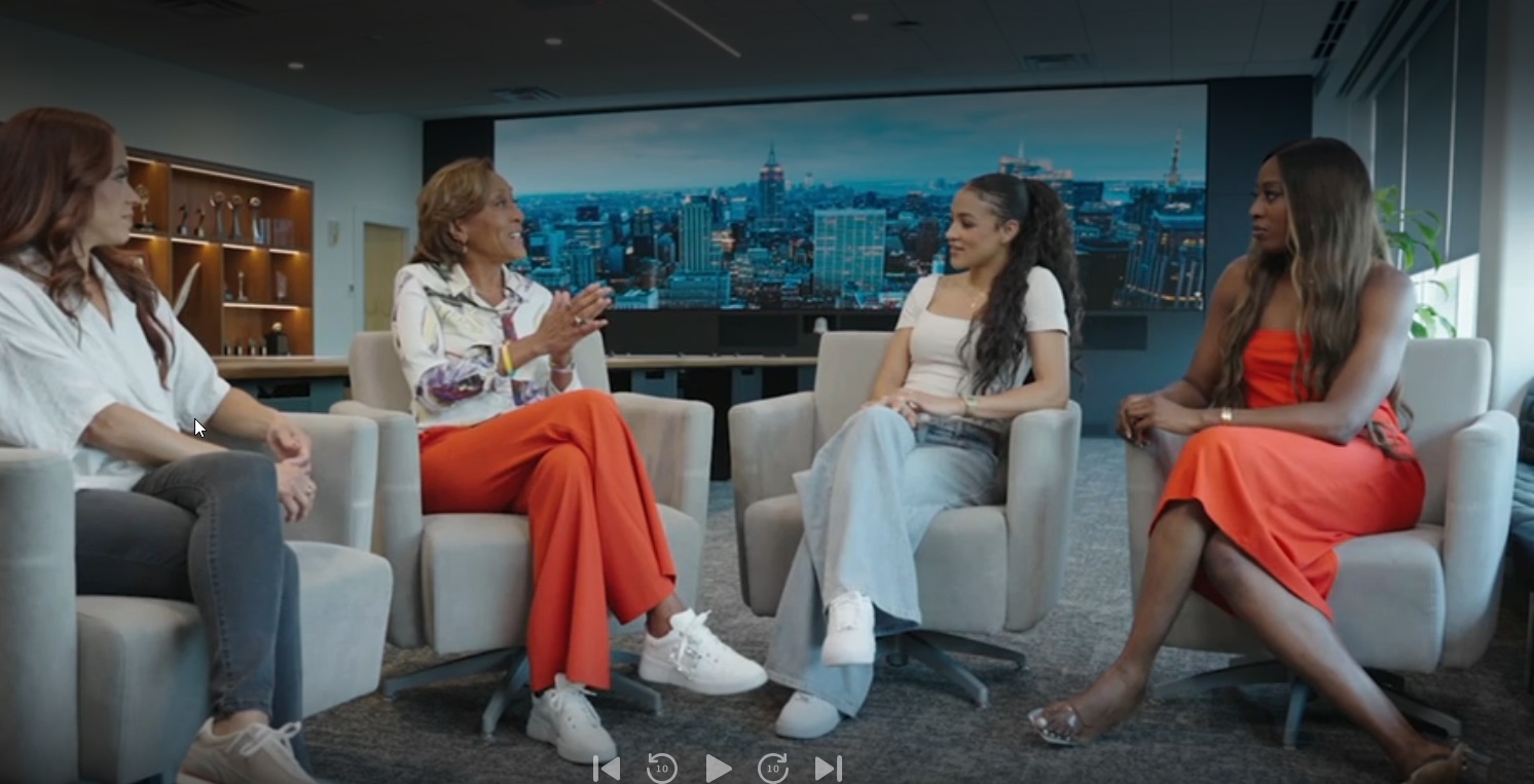 Next, the Big Three sit down with Robin Roberts—not in the comfy studio, but maybe in a large meeting room within the studio complex. With a nod to the show’s title Vibe Check, she shares her perfect vibe: riding in her car listening to her jams, which she explains are R&B or disco. But the trio wants to know how she gets in the zone for early mornings, and Robin shares that Sister Sledge’s We Are Family gets her going when that 3:30 a.m. alarm sounds. She connects with Andraya over meditation. As we are shown highlights from Robin’s career at ESPN’s Bristol campus, she reflects on the culture shock of moving from Atlanta to Bristol in the dead of winter, the gratitude she holds for every opportunity, and her continued drive for more.