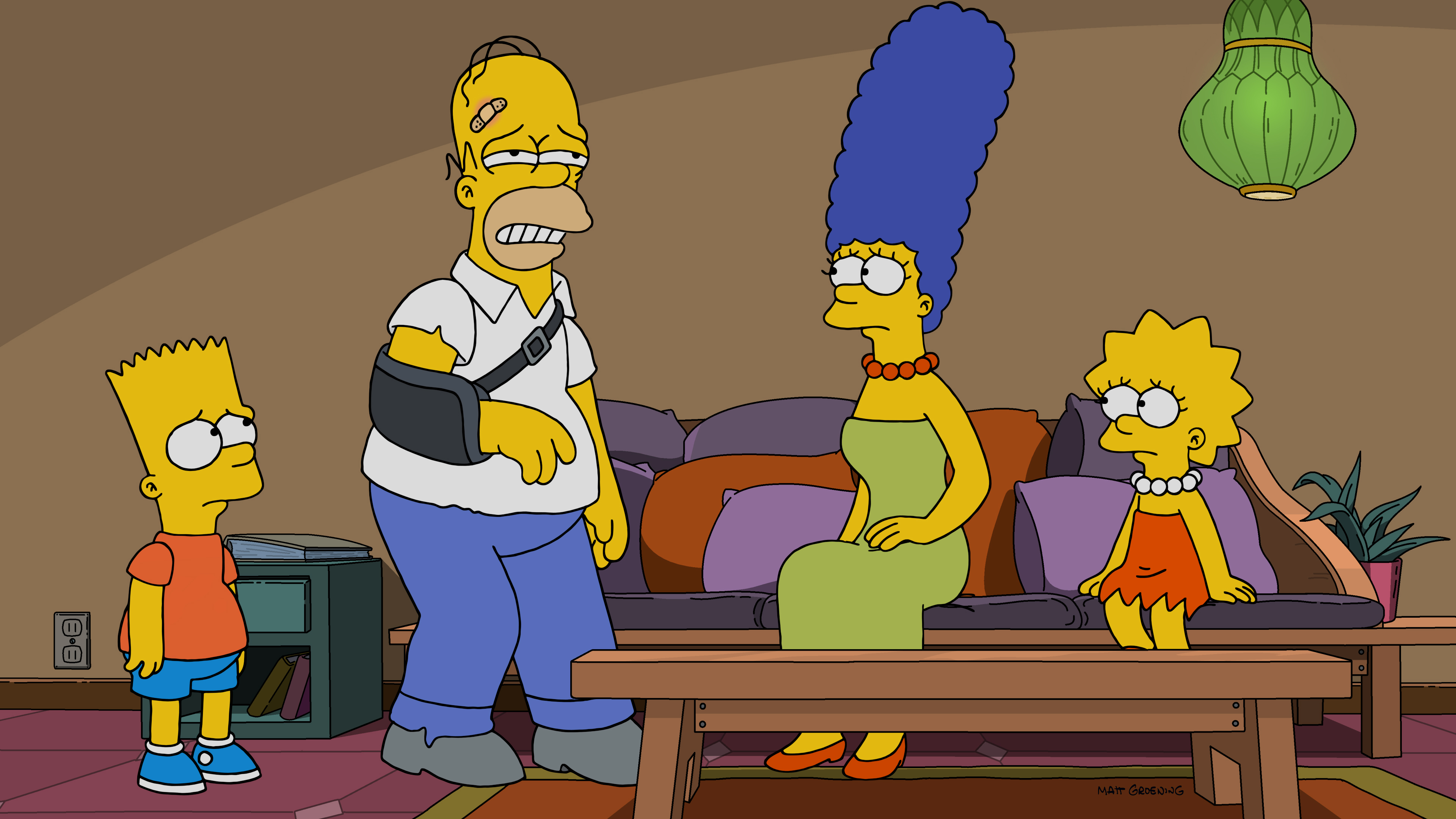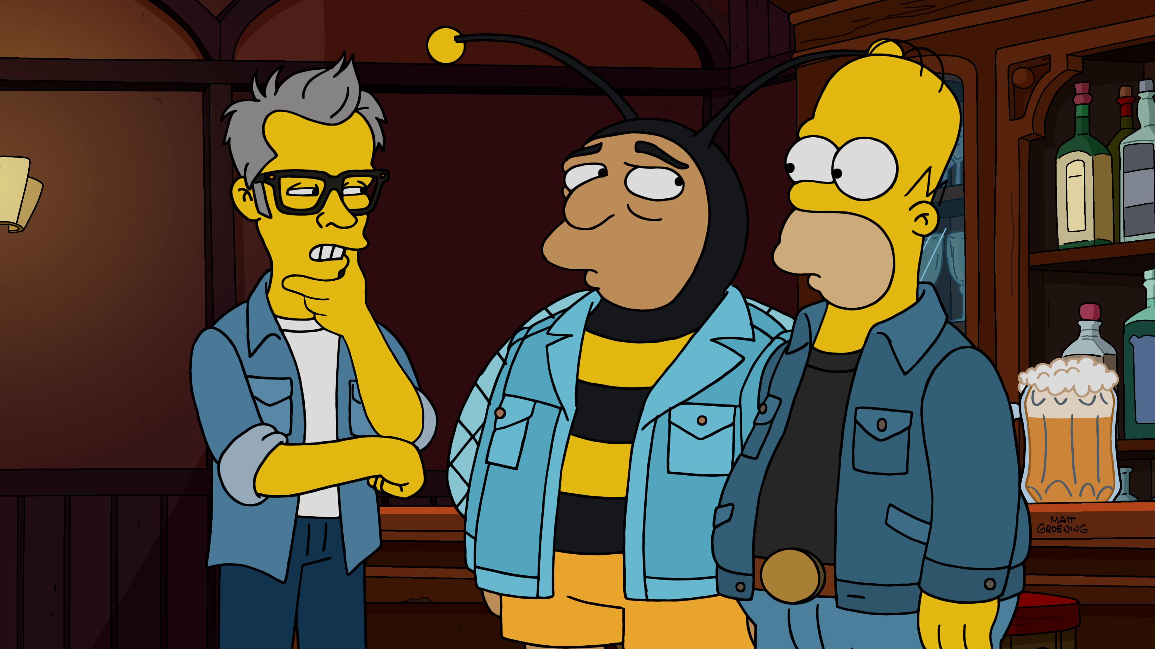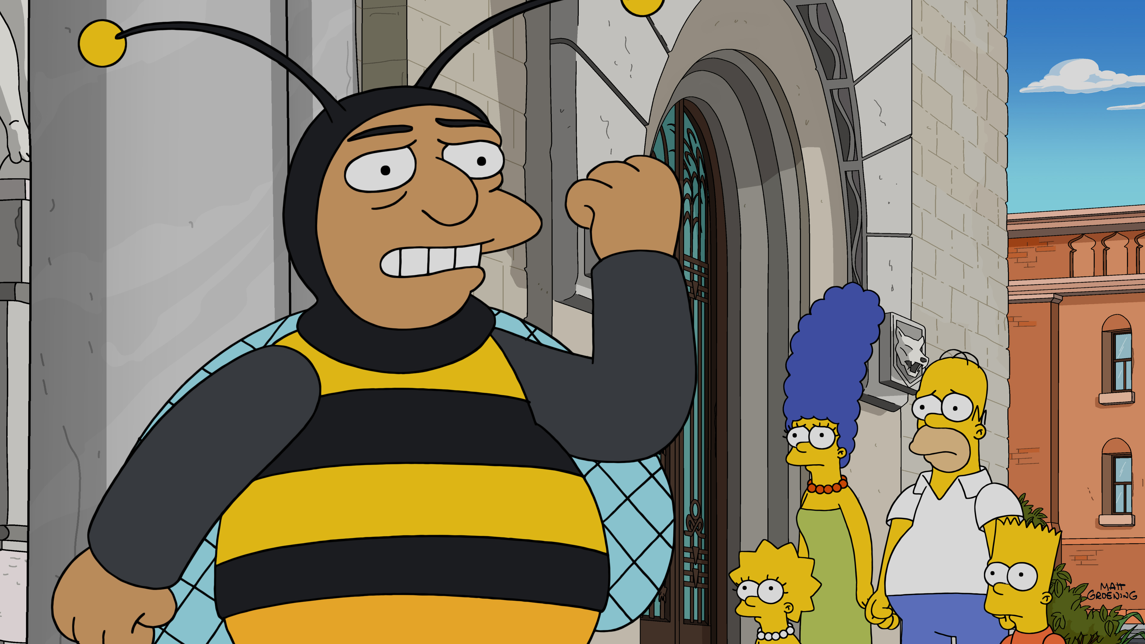 Their plan is to make Homer wear a greenscreen bodysuit under the Bumblebee Man costume, but this only results in Homer getting even more injured than he had been before. Soon an image leaks of Bumblebee Man working with a stunt double, and it turns out that Bart, Marge, and Lisa (Yeardley Smith) had all leaked it to the press to prevent Homer from getting further hurt.