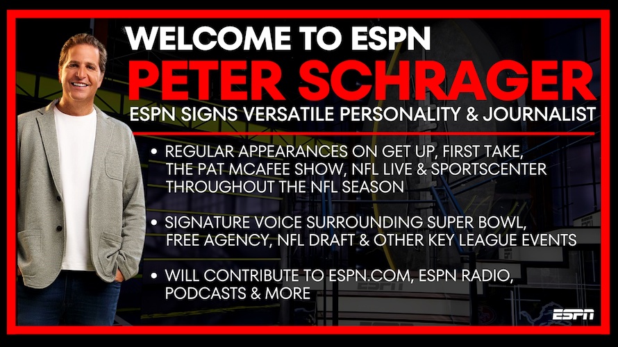 - Peter Schrager: “I’m incredibly excited for this amazing opportunity with ESPN. Beyond their fantastic year-round, wall-to-wall, coverage of the NFL, ESPN is personally special to me in that I grew up watching SportsCenter three or four times every morning before school and swore by that NFL Primetime music with Chris Berman and Tom Jackson doing the highlights on Sunday nights. I can’t wait to be a part of it all and am thrilled to be joining this incredible team."