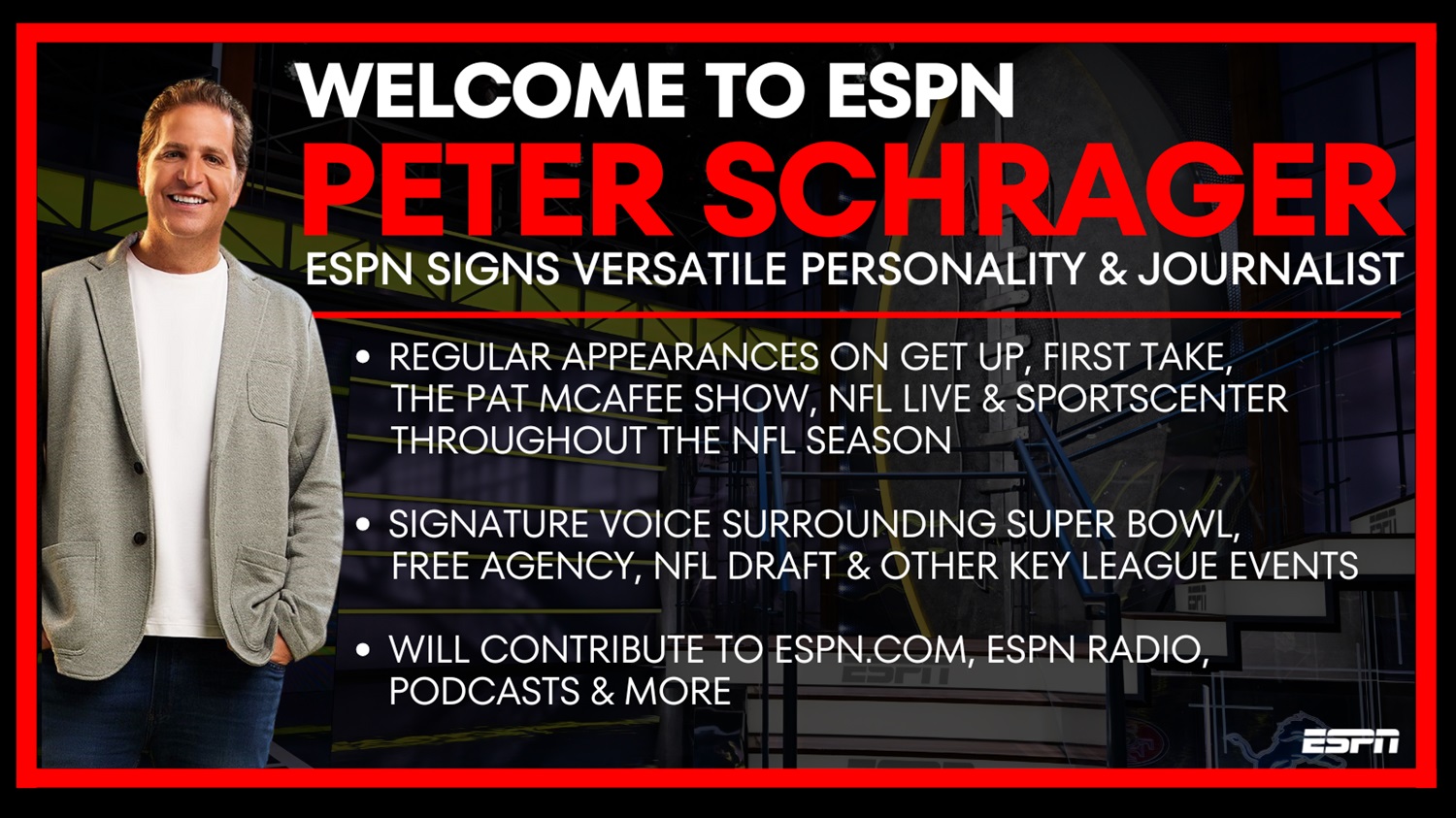- Peter Schrager: “I’m incredibly excited for this amazing opportunity with ESPN. Beyond their fantastic year-round, wall-to-wall, coverage of the NFL, ESPN is personally special to me in that I grew up watching SportsCenter three or four times every morning before school and swore by that NFL Primetime music with Chris Berman and Tom Jackson doing the highlights on Sunday nights. I can’t wait to be a part of it all and am thrilled to be joining this incredible team."