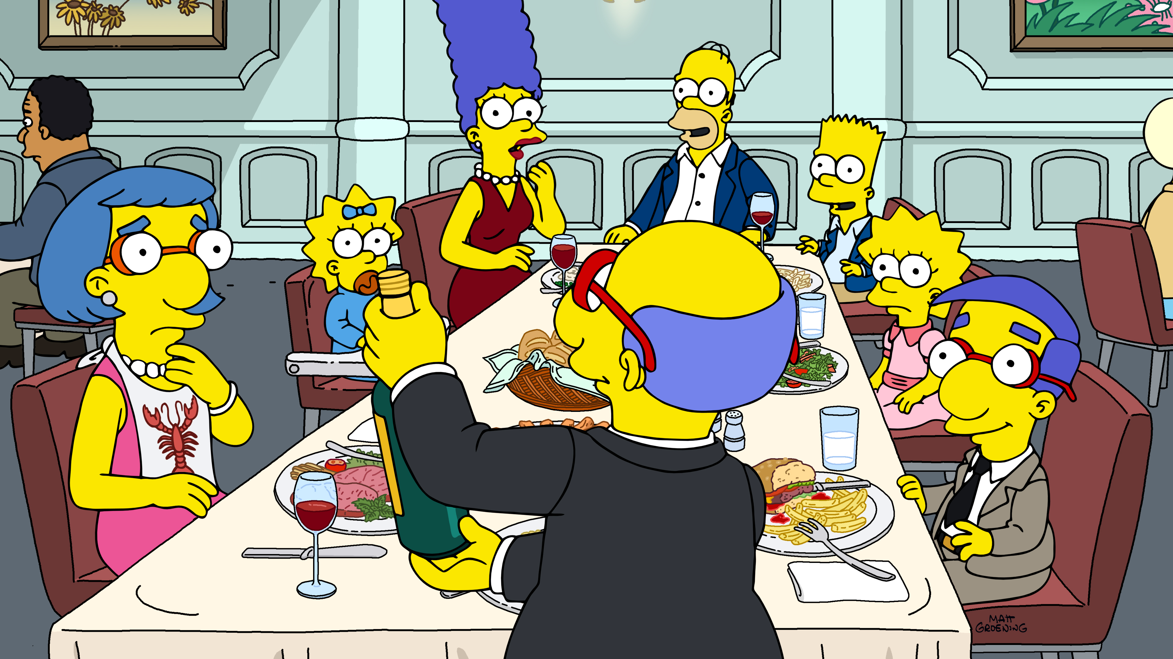 After a successful launch of their business, Kirk takes his family and the Simpson family out to dinner at a fancy-ish restaurant and presents a bottle of wine that cost thousands of dollars. This is where he delivers one of my favorite lines from the episode about how he's confident that their money will never, ever run out and that nothing ever has to end, but outside the restaurant Dr. Hibbert confides in Marge that Kirk had gone off his medication after the shortage caused by the animals and is now riding high on a wave of manic-depressive bipolar disorder. Indeed, when Marge visits the Van Houten's ostentatious new home, she has her suspicions confirmed, and is also accused of wanting to sleep with Kirk by his wife Luanne (Maggie Roswell).