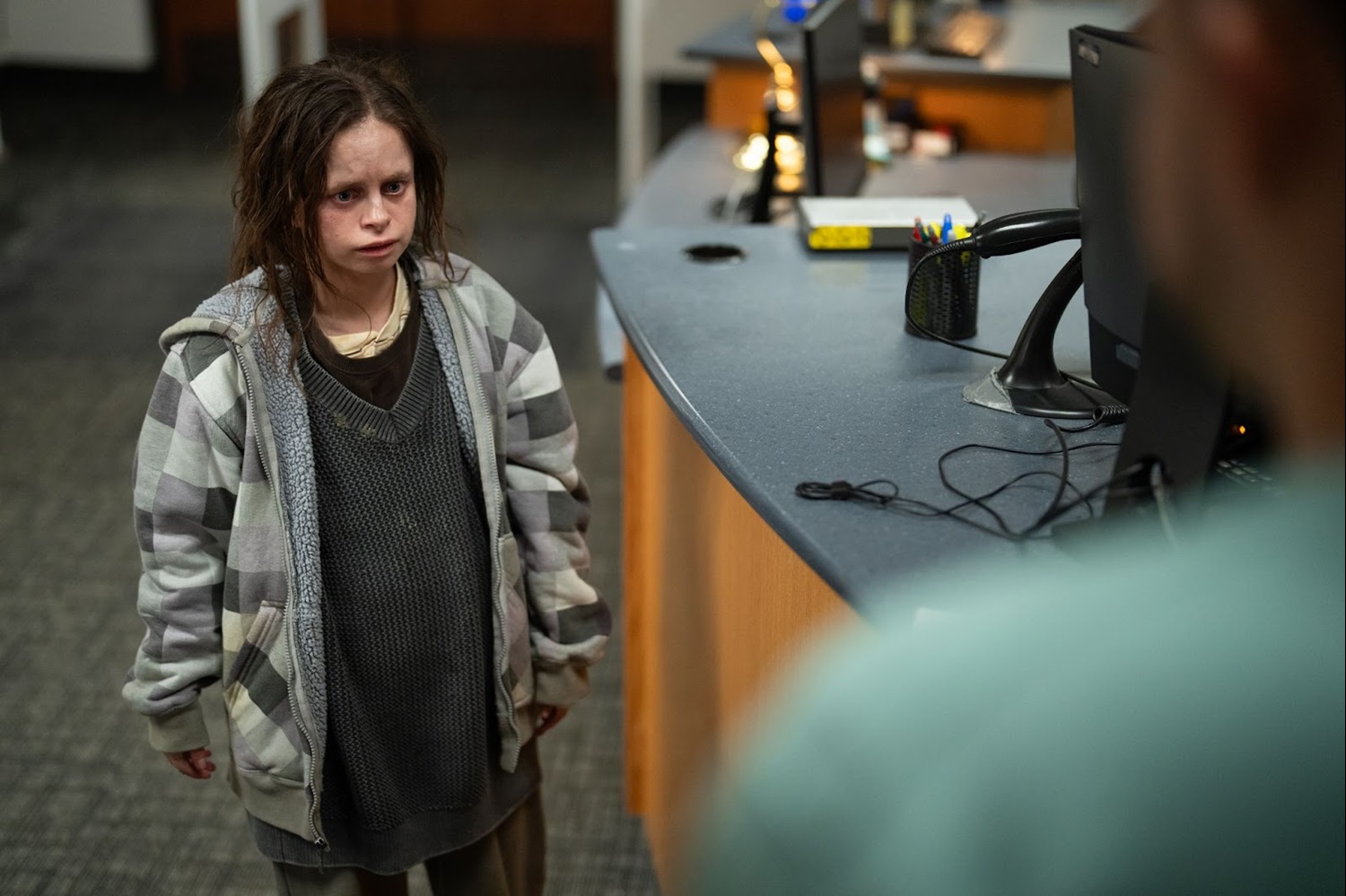 The wait for the next bus is so long that the sun has set. Keaton wants to go back to his grandma’s, worrying he will be in trouble if she wakes up and he’s not there. But Natalia convinces him that her parent’s house is awesome and that they can get snacks there. But when they get to Natalia’s house, there’s a For Sale sign in the front yard. Val (Sarayu Blue) steps out of the house carrying a few items. She tells Natalia that the Barnetts aren’t her family and that she should be in jail for what she did. Val tells Keaton that Natalia Grace scammed the Barnetts, and he tells Val that she told him she was a kid, promising snacks if he joined her.