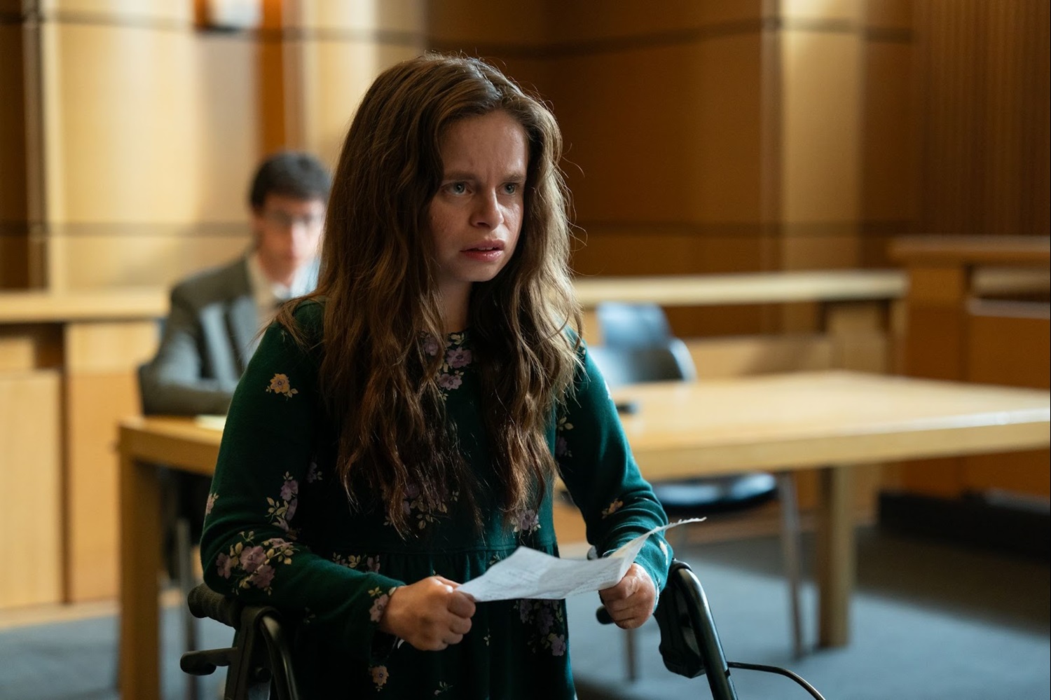 Ken brings a folder to the judge, recent letters from doctors stating that Natalia Grace’s recent exam proves she’s still a child. Terrence calls them irrelevant, and Ken encourages the judge to listen to Natalia Grace’s words. She stands up, ready to approach the bench, when the door opens. In walks Michael Barnett. Natalia Grace is taken aback. She tries to say hi, waving to him, but he ignores her, proceeding to Dr. Lawrence to thank him for coming. Michael wants to speak, and even though Natalia Grace was about to have her turn, the judge allows it.