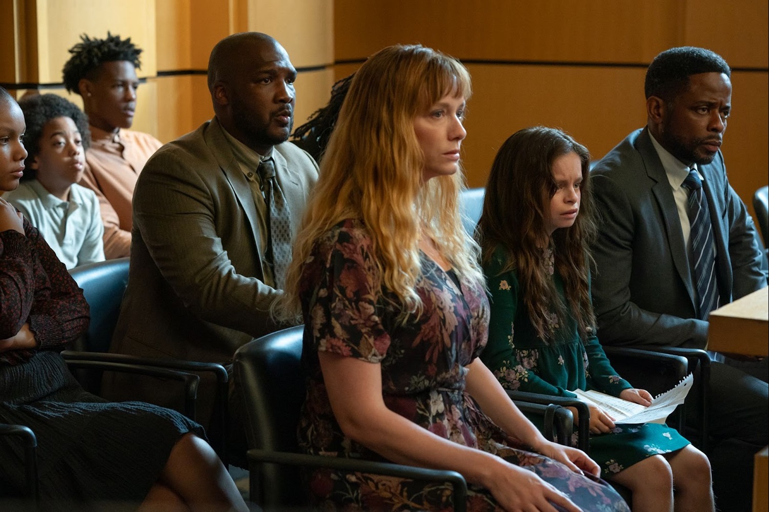 Antwon Mans (Jerod Haynes) and the family pray around Natalia Grace in the courtroom before the judge enters. Terrance is the sole representative for the Barnetts. Natalia Grace’s counselor, Ken Mabry (Jack Sam Shaw), approaches the stand in the motion to appoint Antwon and Cynthia Mans as Natalia Grace’s legal guardians. The judge (Jim Hoffmaster) notes Natalia’s legal age, 27, and cracks a millennial joke, prompting a forced laugh from Terrance. Without access to Natalia Grace’s previous medical records, he refuses to consider that the previous judge should’ve acted differently. Putting a nail in the case’s coffin, Terrance brings Dr. Steven Lawrence (David Paymer) to the stand, who testifies that as the Barnett family doctor and Natalia Grace’s Primary Care Physician, he can certify that she is an adult. He claims that Natalia Grace was menstruating during her time at the psychiatric hospital, where she was diagnosed with sociopathy, a condition that can only be applied to adults. He tells the judge that the Barnetts remain committed to their role as Natalia Grace’s guardians, describing the girl as “a sick individual."