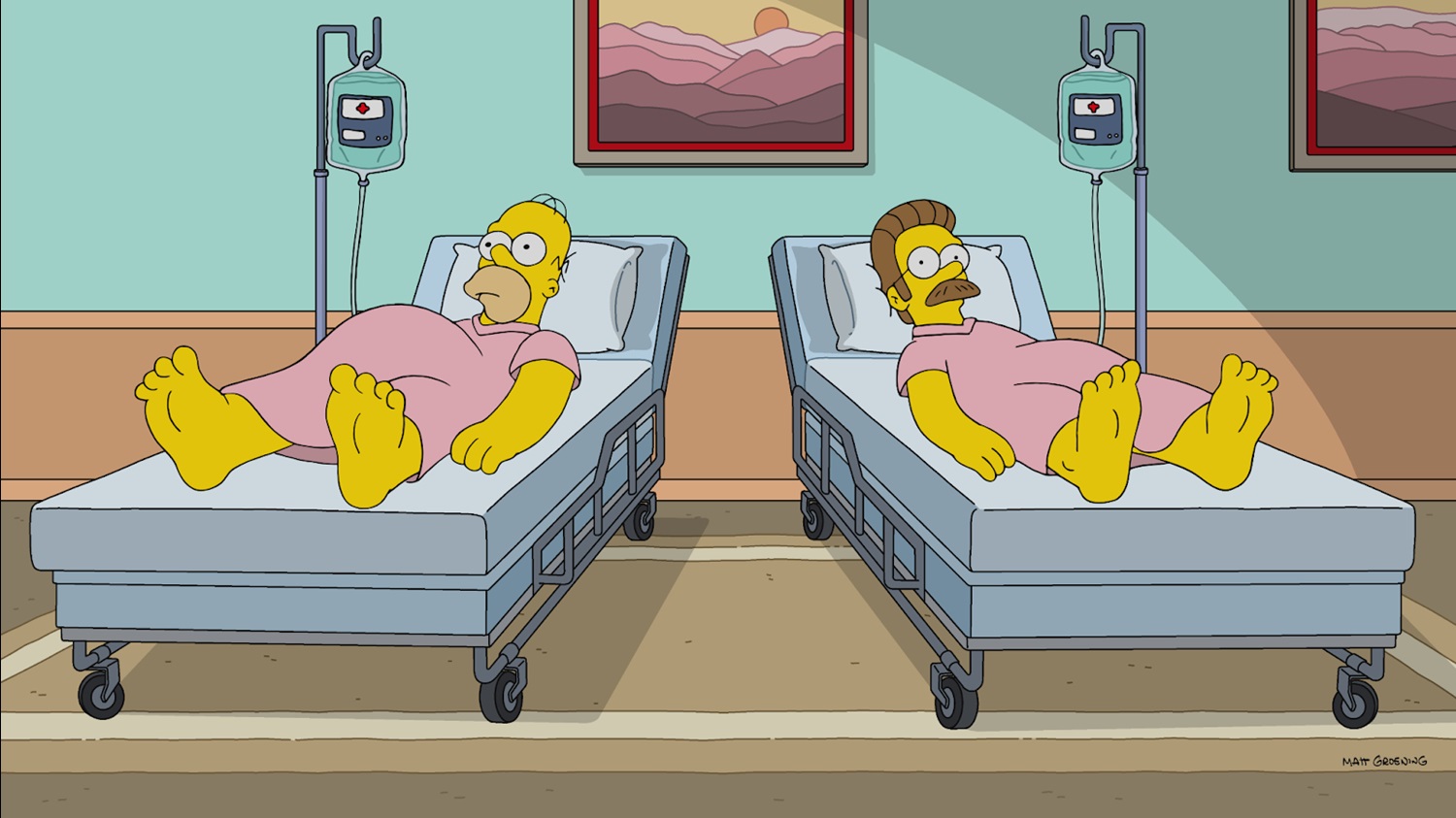 During their shared dream, we see Homer and Ned morph into a number of famous pop-culture duos, and I’m gonna go ahead and list them here because I wanted to go through that sequence again: first they’re Itchy & Scratchy (from The Simpsons, of course), then Buzz Lightyear and Woody (Toy Story), Ernie and Bert (Sesame Street), Batman and Robin (Batman), Mr. Burns and Smithers (The Simpsons again), folk-music duo Simon & Garfunkel, Chewbacca and Han Solo (Star Wars), He-Man and Skeletor (Masters of the Universe), Abbott and Costello performing “Who’s On First?" (The Naughty Nineties), Tattoo and Mr. Roarke (Fantasy Island), Garfield and Odie (Garfield), Daryl Hall and John Oates from Hall & Oates, Napoleon Dynamite and Pedro Sanchez (Napoleon Dynamite), Jesse Pinkman and Walter White (Breaking Bad), Frodo Baggins and Samwise Gamgee (Lord of the Rings), (I think) Pikachu and Ash Ketchum (Pokémon), and Lucy Van Pelt pulling the football away from Charlie Brown (Peanuts).