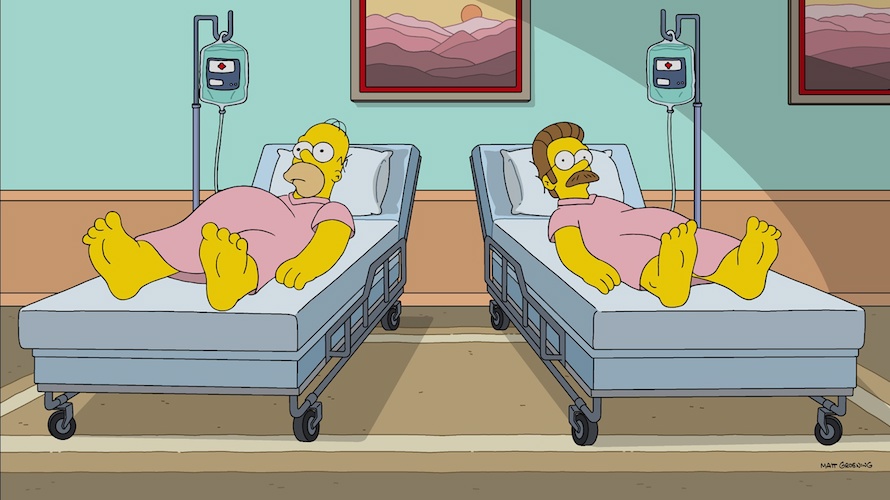Homer tries all manner of methods to get Ned to start speaking with him again, including having Marge (Julie Kavner) go over and talk to him, but none of it works, so eventually Homer writes a multi-page apology, which only serves to make Flanders even angrier because it proves that Homer is a real human being with feelings who should never have treated Ned that way for all those years. This culminates with Ned stealing back everything Homer had ever borrowed from him and feeding most of it into a wood chipper, and then the two neighbors having a sort of demolition derby in the street outside their houses. In a courtroom after that confrontation, Judge Harm (recurring guest star Jane Kaczmarek) sentences the two frenemies to couples counseling, at which they are encouraged by therapist Annette (My Crazy Ex-Girlfriend’s Rachel Bloom) to take transcendental medication together. This leads to a trippy dream sequence that I suspect was the highlight of the behind-the-scenes making of this episode, because it certainly was my favorite part of watching it.