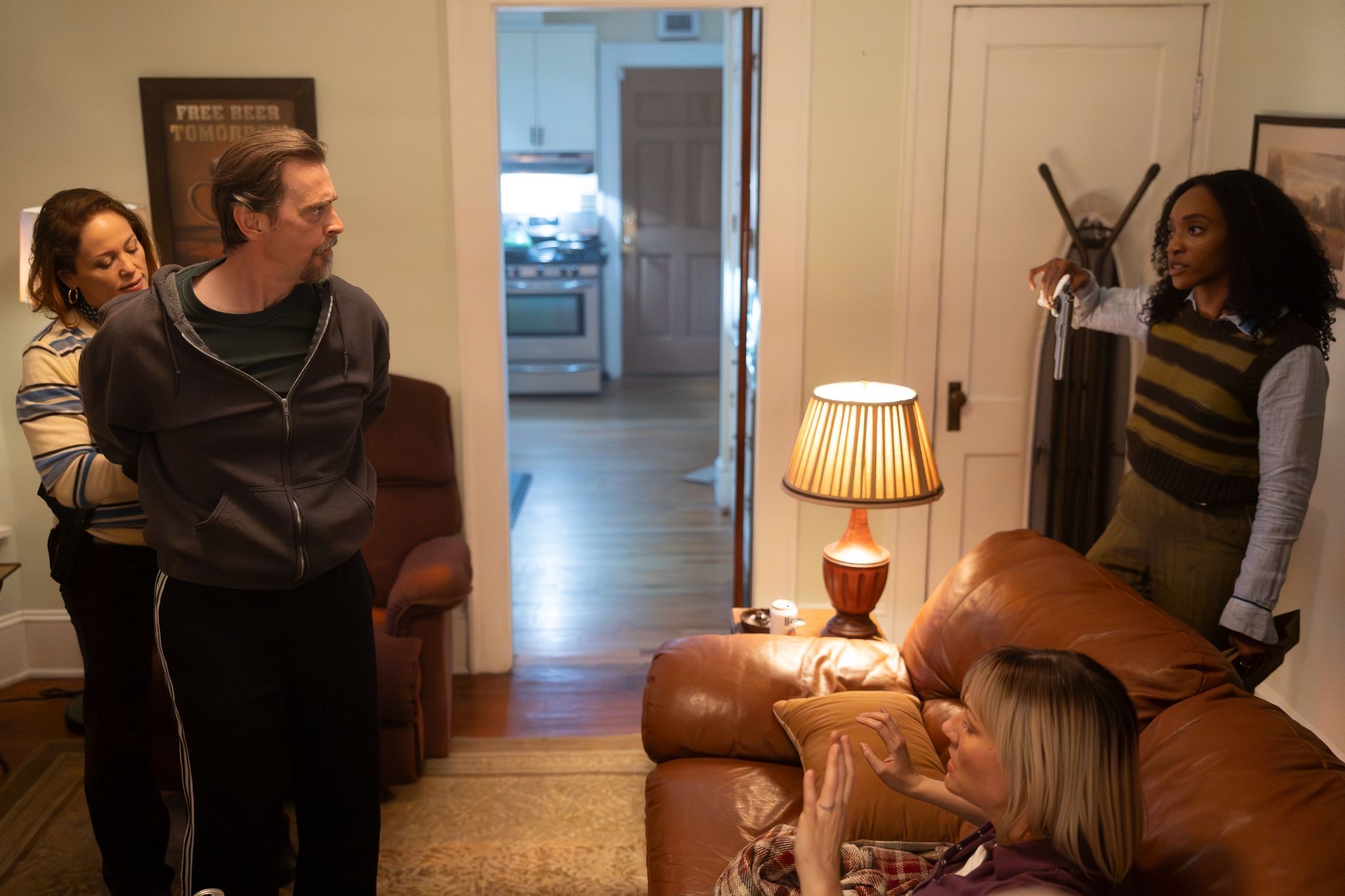 Will and Ava descend into Murph's basement, a silent disco where everyone is dancing to “Shout.” They spot the urn on a pedestal display. Will and Ava dance through the crowd inconspicuously, bumping together in a quietly romantic moment. Reaching the urn, Will sets down cash matching what Murph paid. They begin to leave, but Murph comes downstairs and puts on headphones to join the party. Will guides them toward the stairs, shielding the urn behind dancers. Then the music hits the "a little bit softer now" portion of the song, and the entire crowd crouches low, leaving Will and Ava exposed. Murph spots them and yells at them to put it down, instructing his partner to call the police.