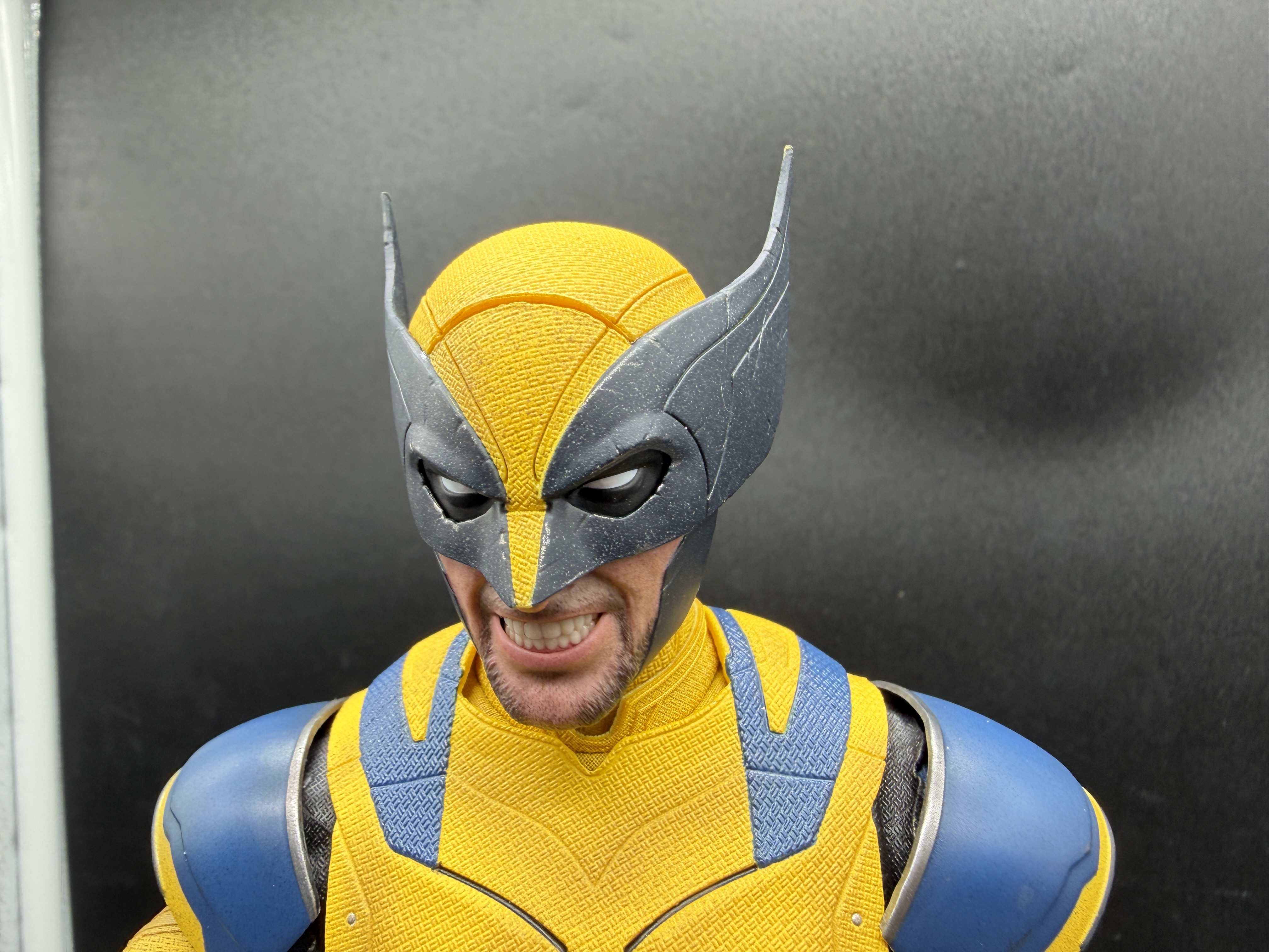 That's quickly fixable fortunately, via changing up the placement of those magnets and shouldn't be a problem unless you've got a kid actually actively playing with this figure (which you shouldn't do, because man, this is way too pricey for that!). So yeah, I suspect there were good reasons they didn't use this exact look in the movie, but regardless, we now have this figure able to even more closely look like Wolverine's stepped right out of the comics, and it's pretty much perfect. Because by comparison, take a look at that photo below, where he's sporting his exact look from the big fight against the Deadpool Corps in Deadpool & Wolverine. He still looks good, absolutely, but come on... That dude could use some snazzy shoulder gear!