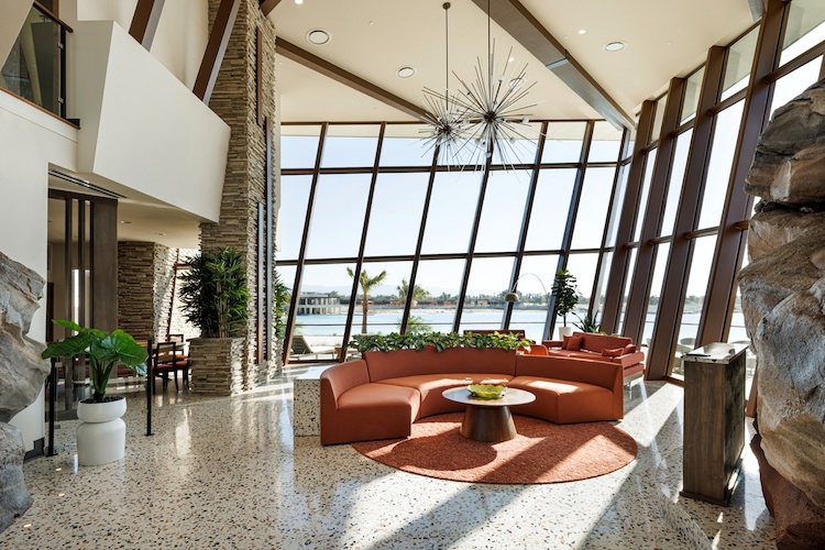 - Situated along the shoreline of Cotino Bay, the building features a distinctive angled roofline and massive floor-to-ceiling windows that provide spectacular views of the bay and surrounding mountains.