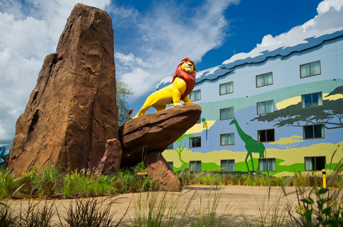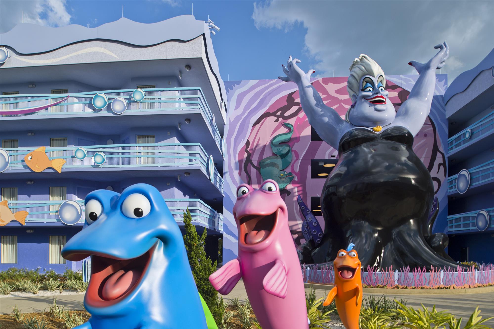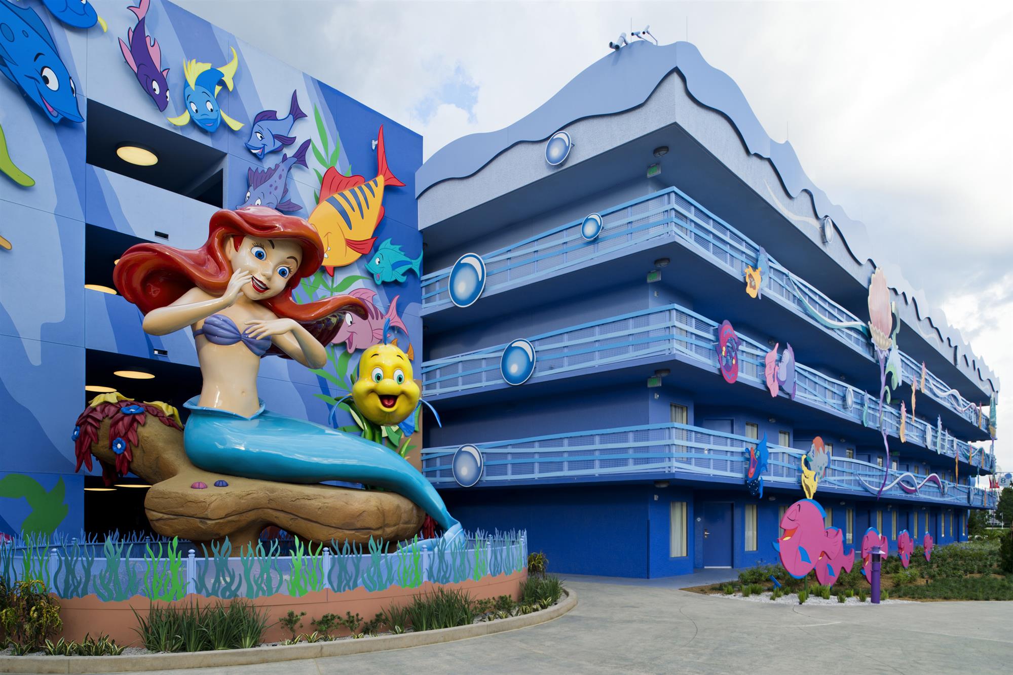 The Art of Animation Resort bases its theme on Disney animated films. The 87 acre resort has themed room interiors in nearly all of the 2,000 units and 864 themed rooms in The Little Mermaid (non-suite) wings. Animation Hall is the main building and houses the front desk, concierge, the Ink and Paint Shop, the Landscape of Flavors eatery, and arcade.