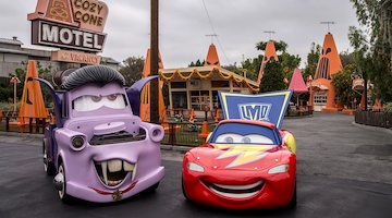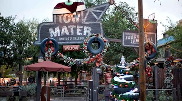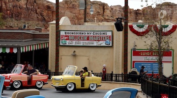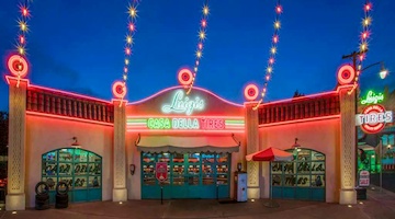 Ride into the world of Radiator Springs for a Jamboree with Mater, a dance with Luigi and his family, and of course a full-blown race to the finish. Visit the Cozy Cone Motel for tasty snacks or grab a hearty sandwich at Flo's; gear up for the road with souvenirs from Sarges's Surplus Hut, and be sure to get your picture taken on Route 66! During Halloween, the entire area is decorated for "Hally Haul-O-Week from Cars Land" and during the holidays it's "Season's Speedings from Cars Land". For both seasons, two of the attractions have slightly updated versions.