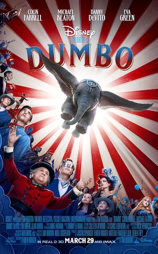 The all-new live-action adventure “Dumbo” expands on the beloved classic story where differences are celebrated, family is cherished and dreams take flight. Circus owner Max Medici (Danny DeVito) enlists former star Holt Farrier (Colin Farrell) and his children Milly (Nico Parker) and Joe (Finley Hobbins) to care for a newborn elephant whose oversized ears make him a laughingstock in an already struggling circus. But when they discover that Dumbo can fly, the circus makes an incredible comeback, attracting persuasive entrepreneur V.A. Vandevere (Michael Keaton), who recruits the peculiar pachyderm for his newest, larger-than-life entertainment venture, Dreamland. Dumbo soars to new heights alongside a charming and spectacular aerial artist, Colette Marchant (Eva Green), until Holt learns that beneath its shiny veneer, Dreamland is full of dark secrets.