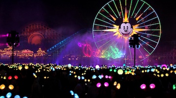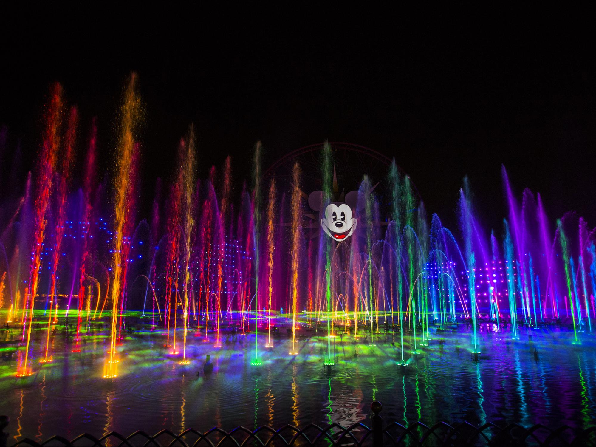 WORLD OF COLOR -- Lights, water, music, fire and animation come together like never before in "World of Color" at Disney California Adventure park in Anaheim, Calif. The show combines nearly 1,200 powerful fountains with heights that range from 30 feet to 200 feet in the air, dazzling colors and a kaleidoscope of audio and visual effects, including both classic and new animation projected on one of the world's largest projected water screens --- a wall of water 380 feet wide by 50 feet high for a projection surface of 19,000 square feet . Presented on Paradise Bay in Disney California Adventure park, "World of Color" is a major milestone in the multi-year expansion of the park. (Paul Hiffmeyer/Disneyland)