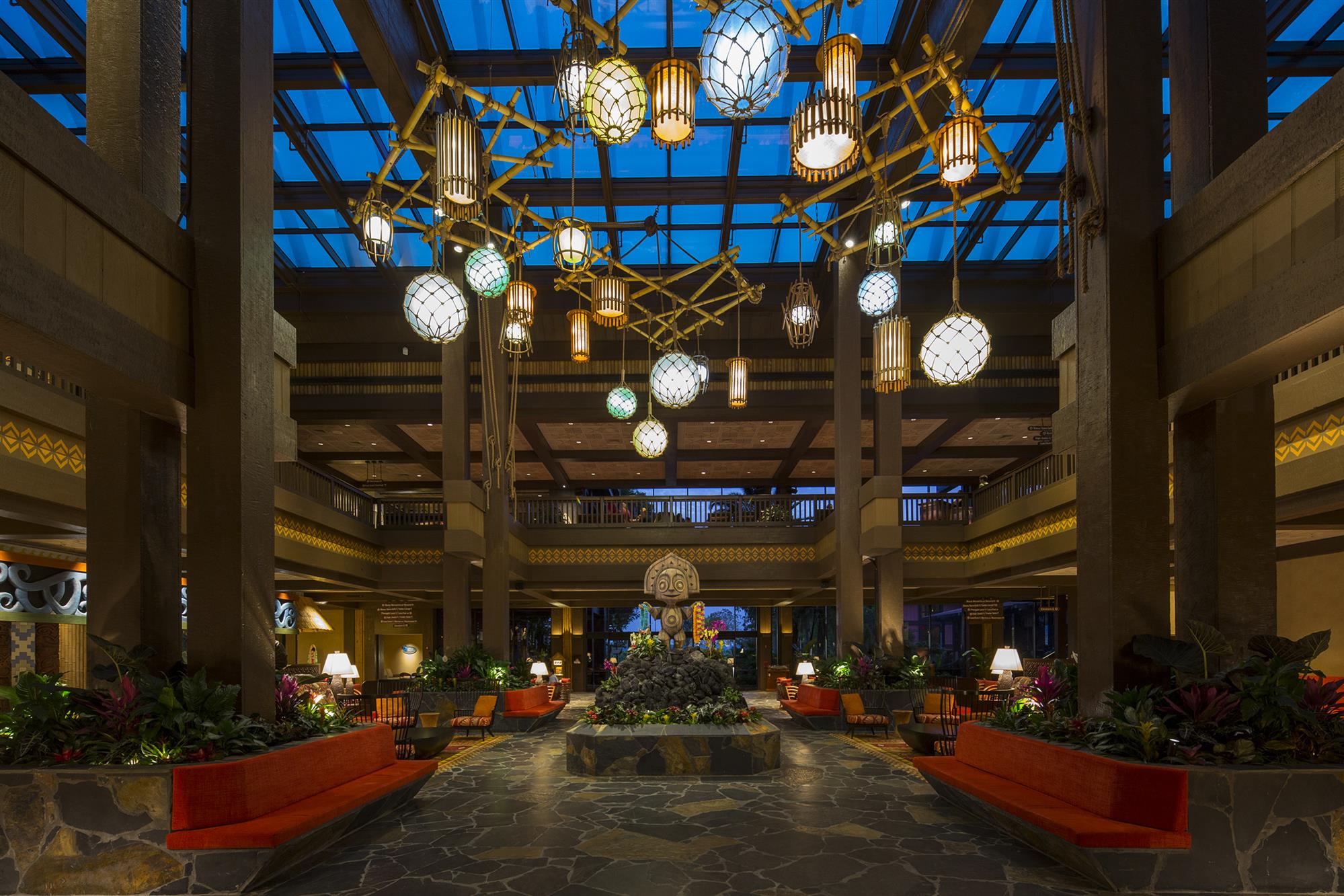 Disney's Polynesian Village Resort features a South Pacific, tropical theme. The 39 acre, 847-room resort has two monorail stations and sits on on the shores of Seven Seas Lagoon. The resort has a casual, island atmosphere and is very family-oriented.