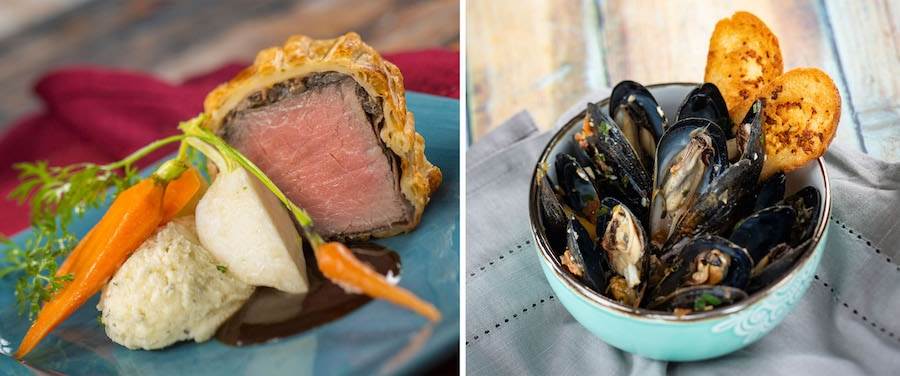 - Beef Wellington: Mushroom duxelles, prosciutto, and puff pastry with red wine demi-glace