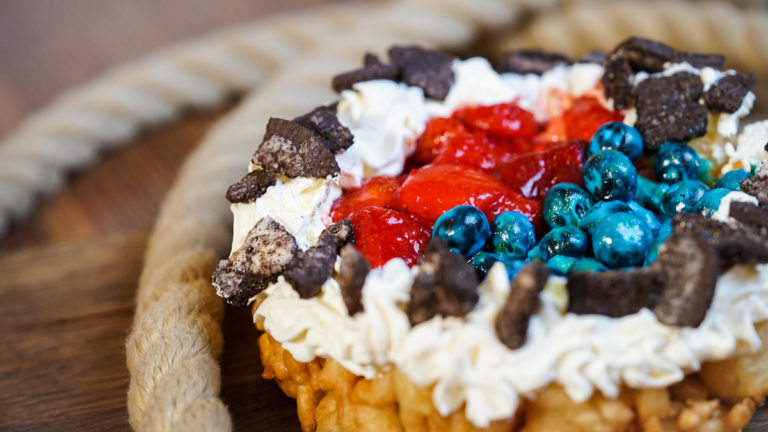 - Jessie’s Berry Jubilee Funnel Cake (House-made funnel cake topped with blueberries, strawberries, chocolate cookie crumbles, crème anglaise, white chocolate, and gold-dusted whipped cream) – Golden Horseshoe, Disneyland park