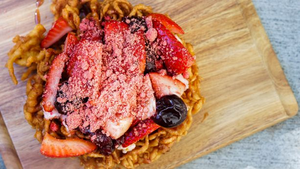 - Lots-o’-Straw-“Bear”-y Funnel Cake (Strawberry-cherry topping, strawberry butter and streusel, with spiced syrup drizzle) – Hungry Bear Restaurant, Disneyland park