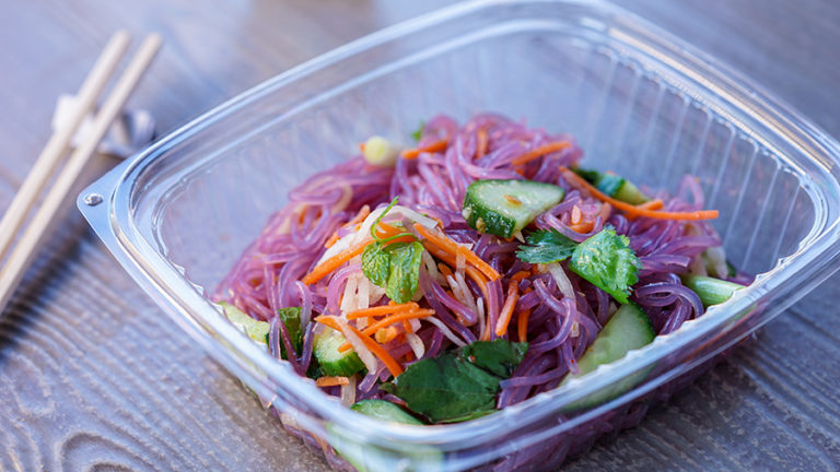 - Chilled Noodle Salad (iridescent noodles, herbaceous preserved plants, sweet and spicy vinaigrette, crushed and toasted peanuts, mint, Thai basil, shredded daikon, and carrots — Pacific Wharf, Disney California Adventure