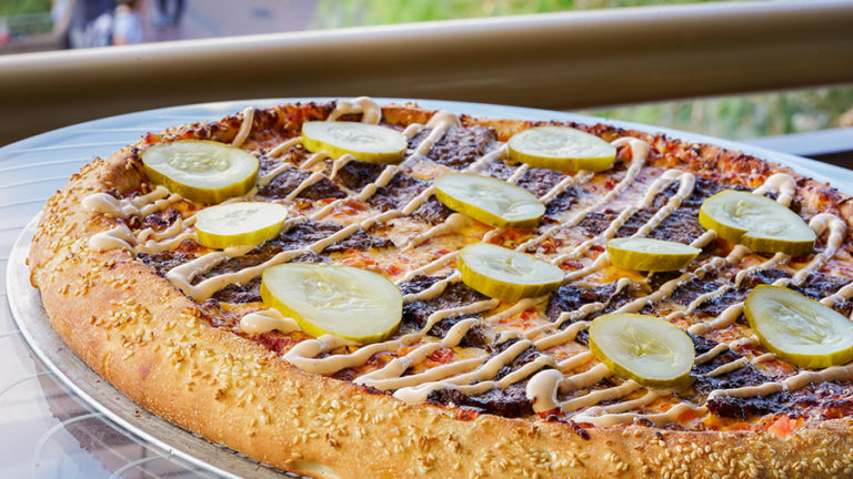 - Cheeseburger Pizza (ketchup, yellow mustard, pizza sauce, sesame seed crust, topped with American and Cheddar cheese, caramelized onions, diced tomatoes, slider patties, house-made burger sauce, and pickles) — Tomorrowland, Disneyland park