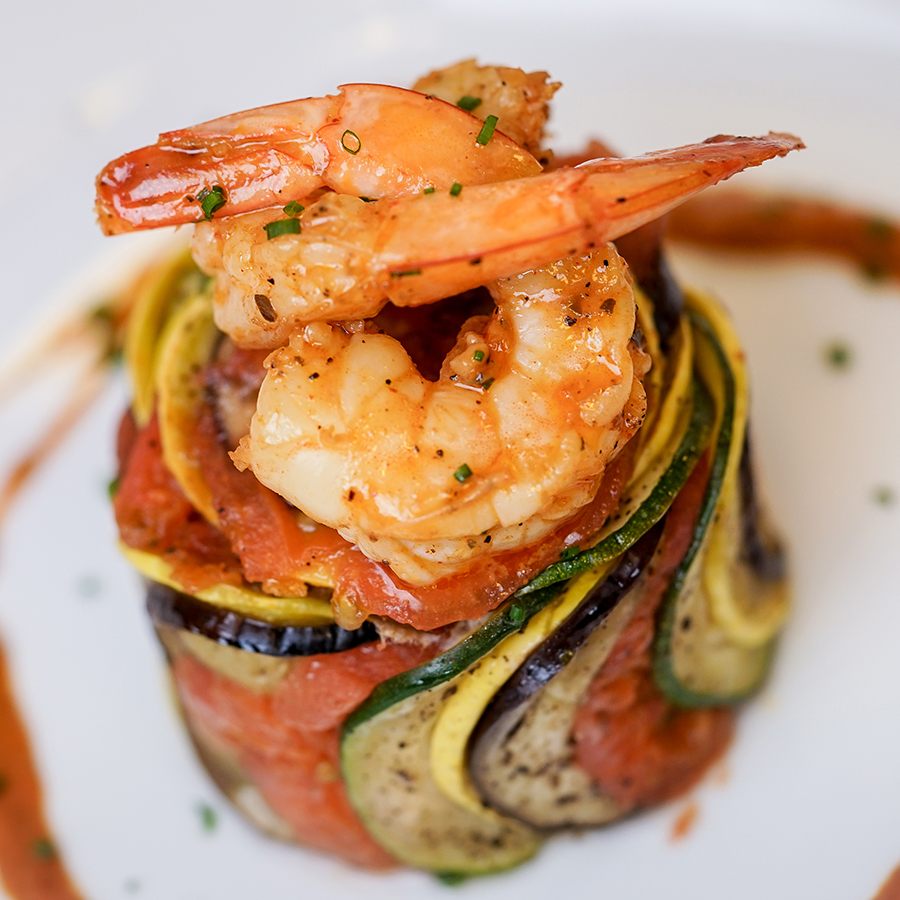 - Cafe Orleans Three-Course Meal (specialty cheese flight with three cheeses, dried fruit, and honeycomb; Shrimp Ratatouille Byaldi layered with roasted zucchini, yellow squash, eggplant, and tomato; Berry-Stuffed Beignets à la Mode served with a sweet brie drizzle and mascarpone) — New Orleans Square, Disneyland