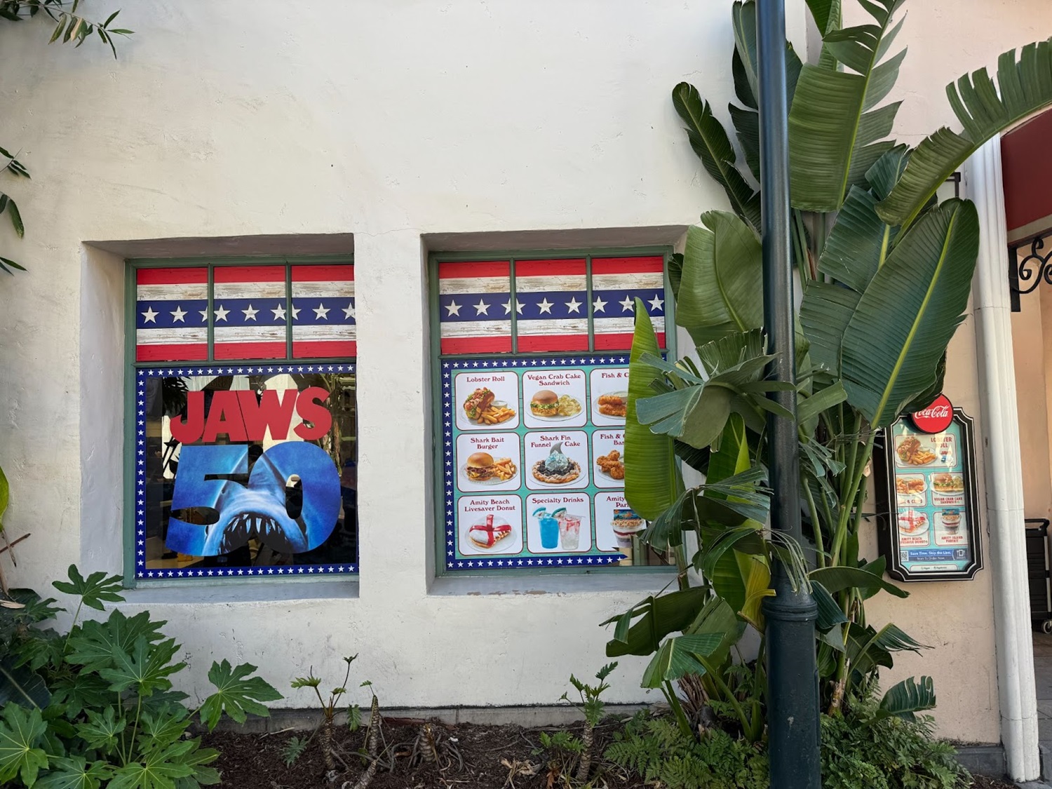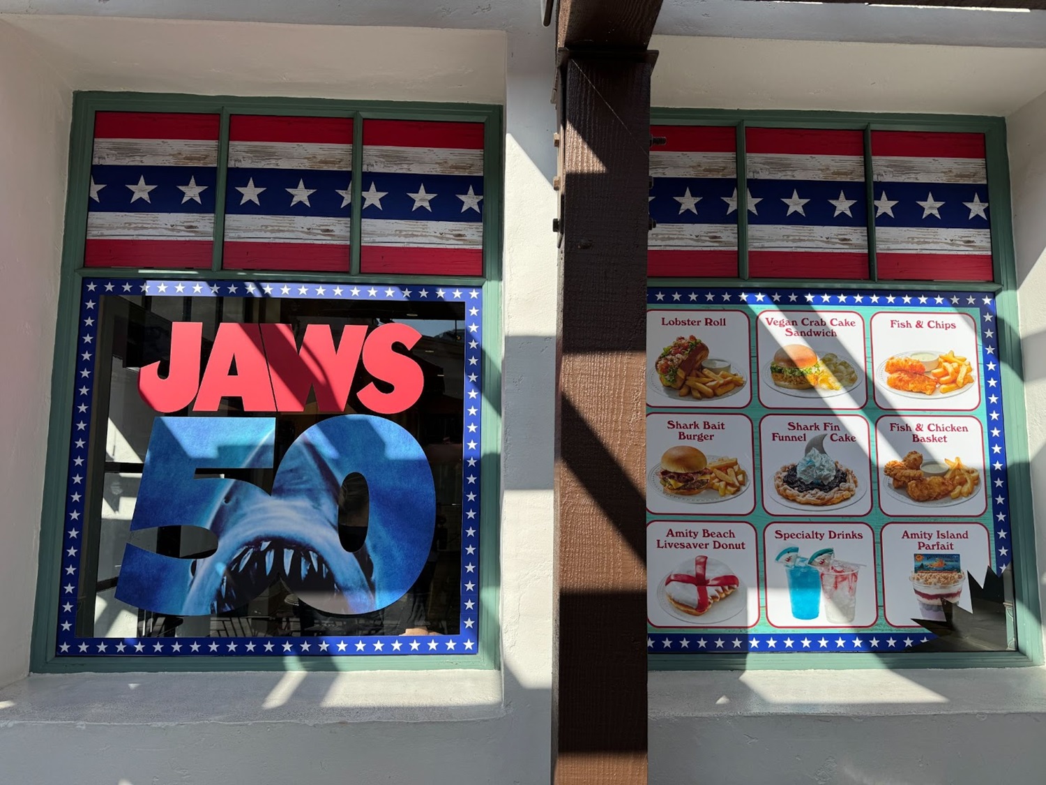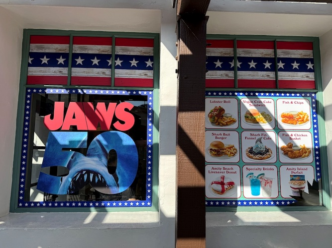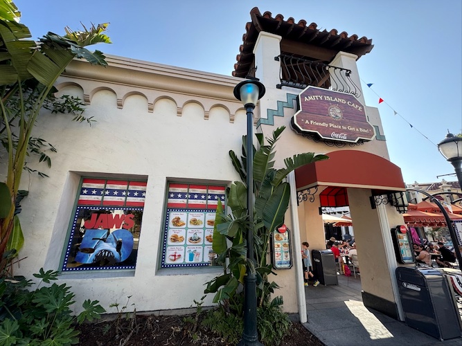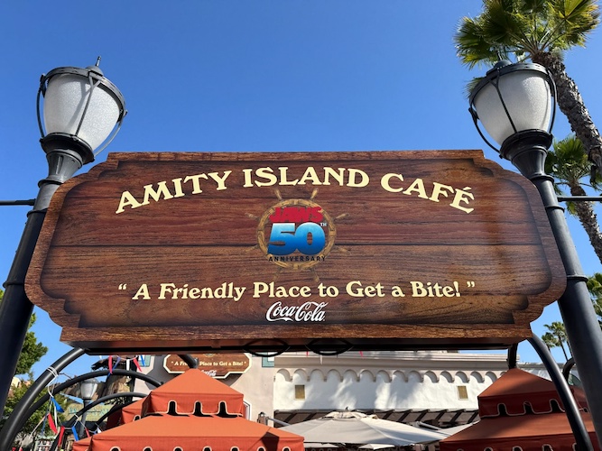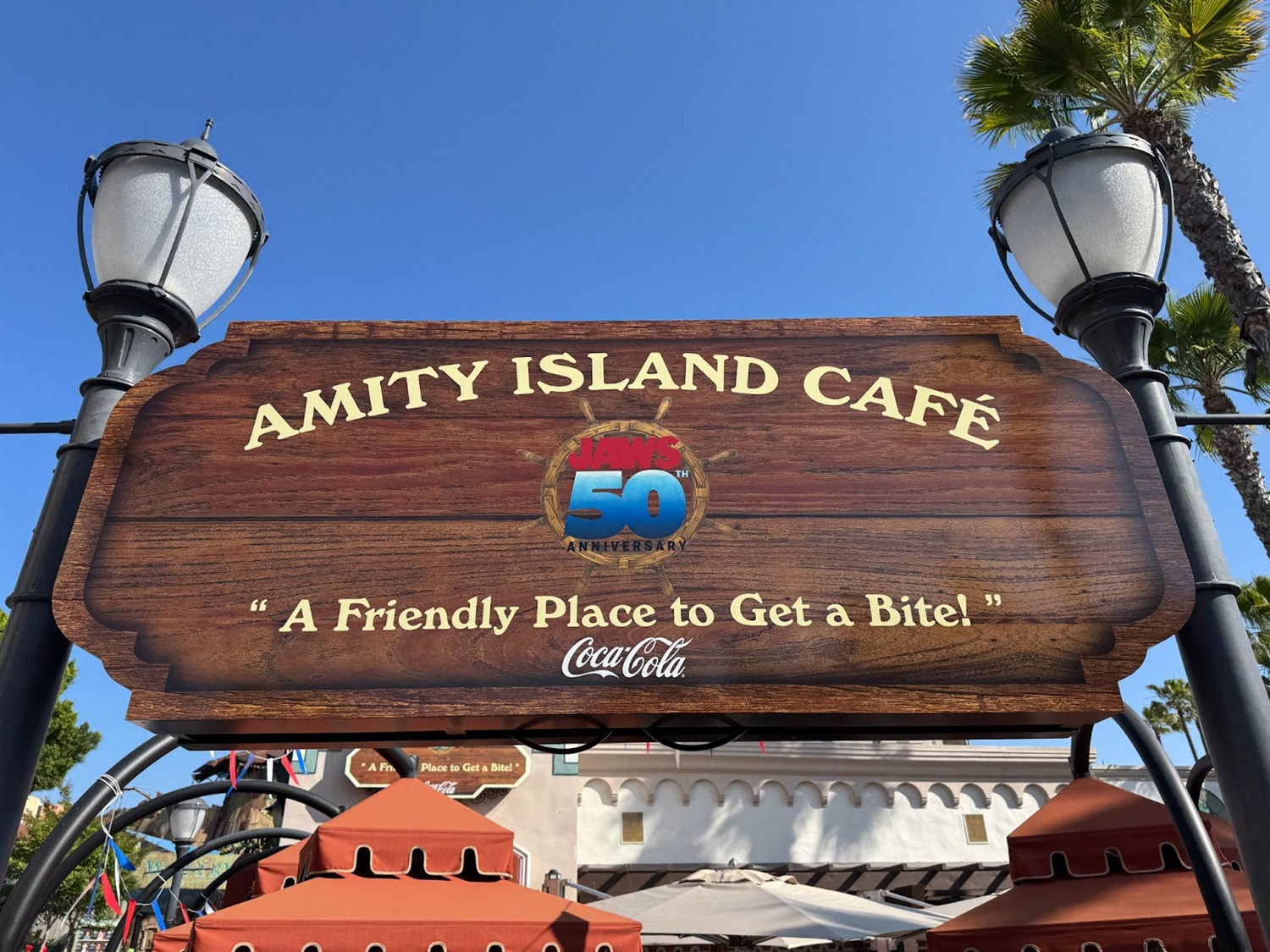 During my visit to Universal Studios Hollywood yesterday for the kickoff of Mega Movie Summer, I was able to stop by the theme park’s Hollywood & Dine counter-service restaurant to check out its new Amity Island Cafe overlay in celebration of the 50th anniversary of Steven Spielberg’s Jaws.