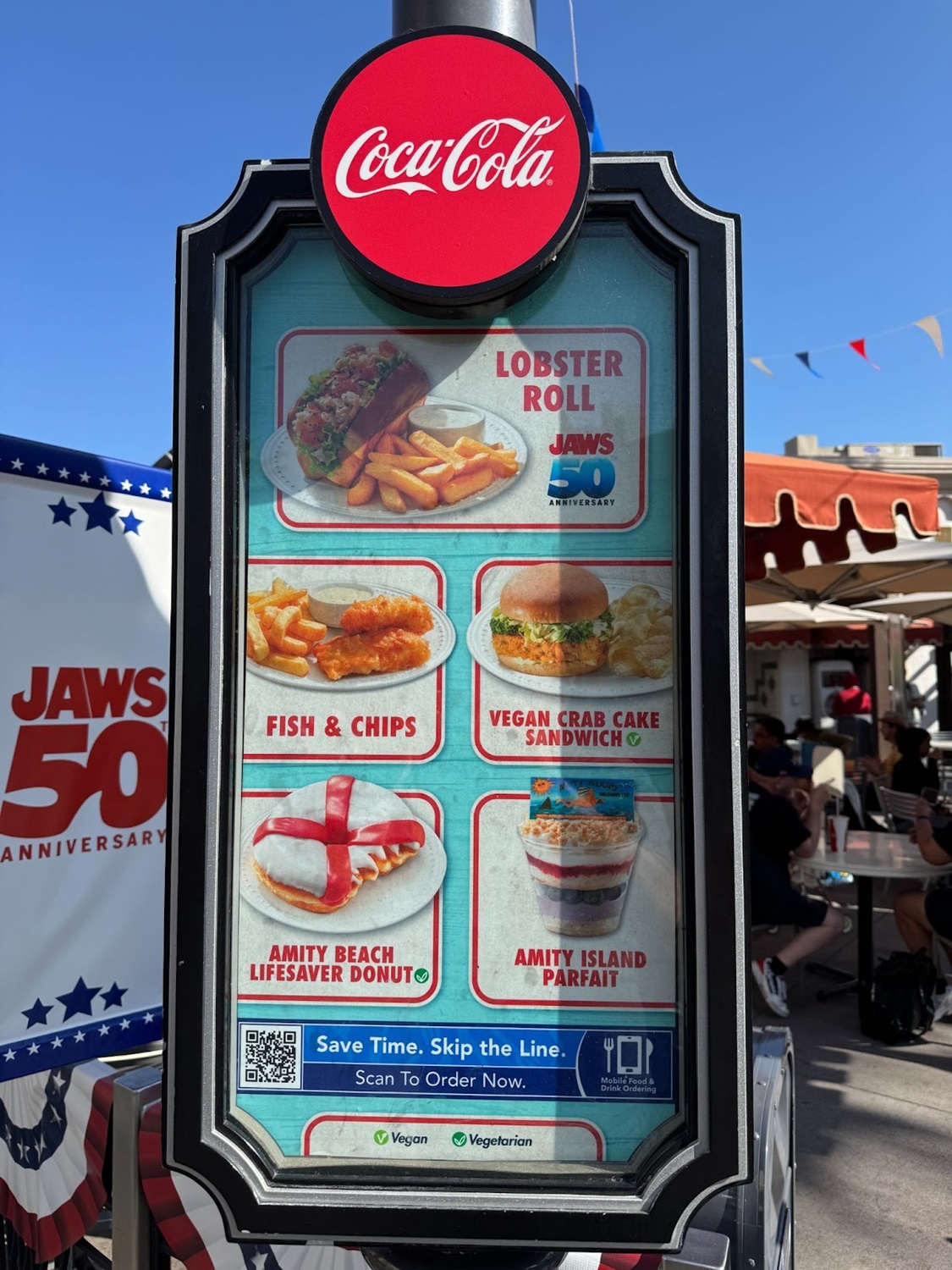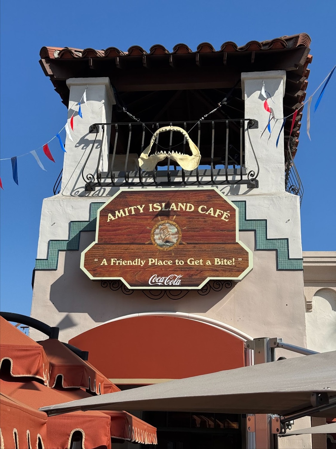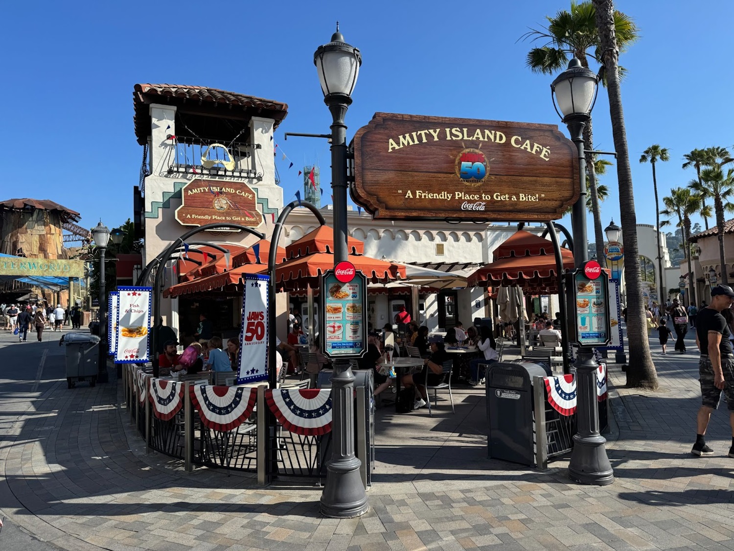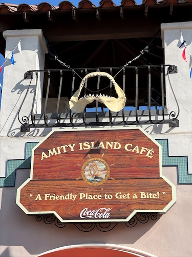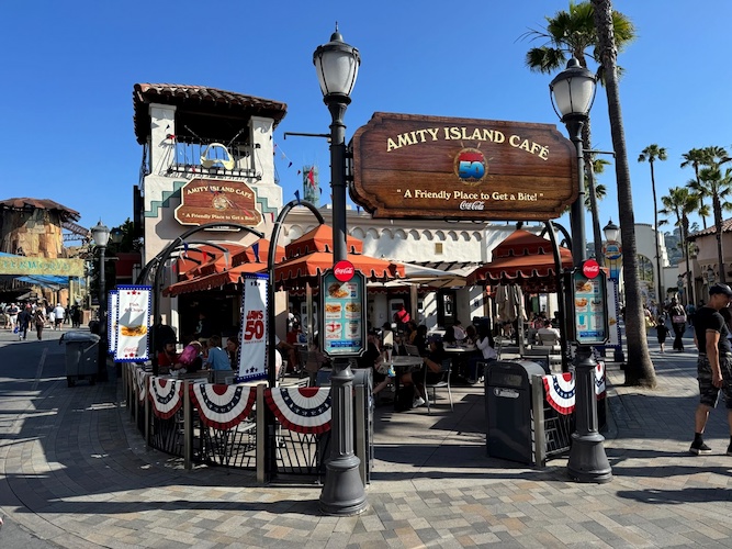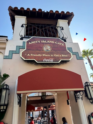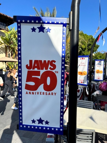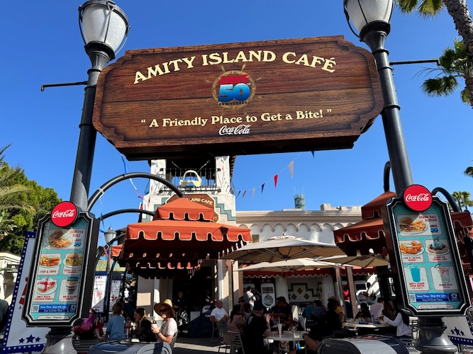 During my visit to Universal Studios Hollywood yesterday for the kickoff of Mega Movie Summer, I was able to stop by the theme park’s Hollywood & Dine counter-service restaurant to check out its new Amity Island Cafe overlay in celebration of the 50th anniversary of Steven Spielberg’s Jaws.