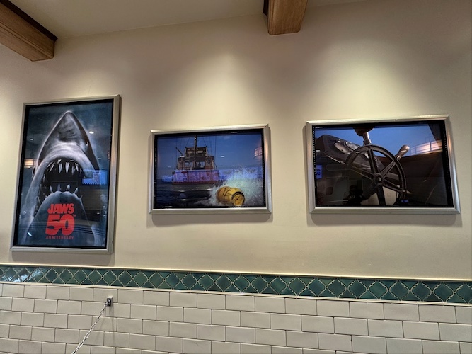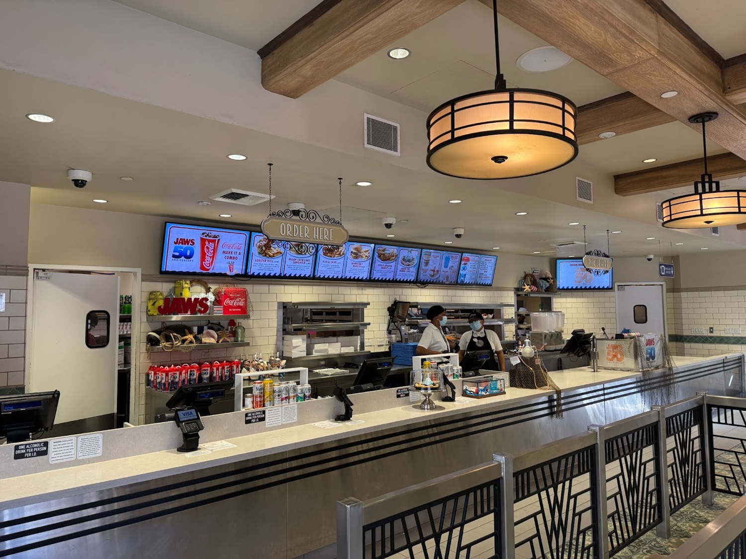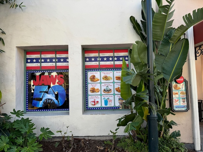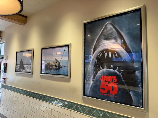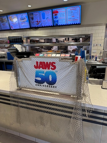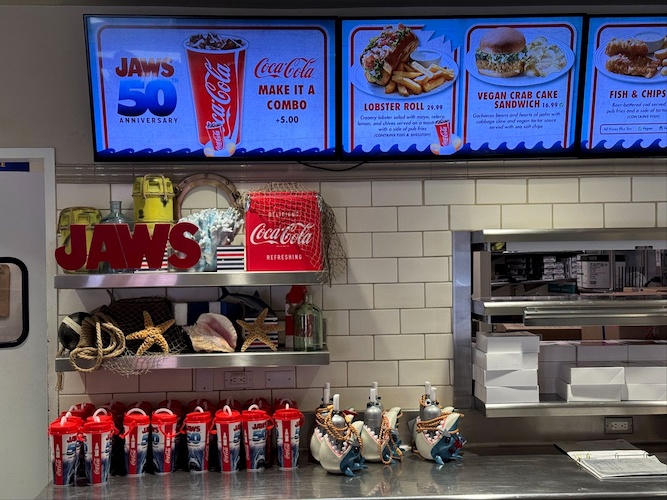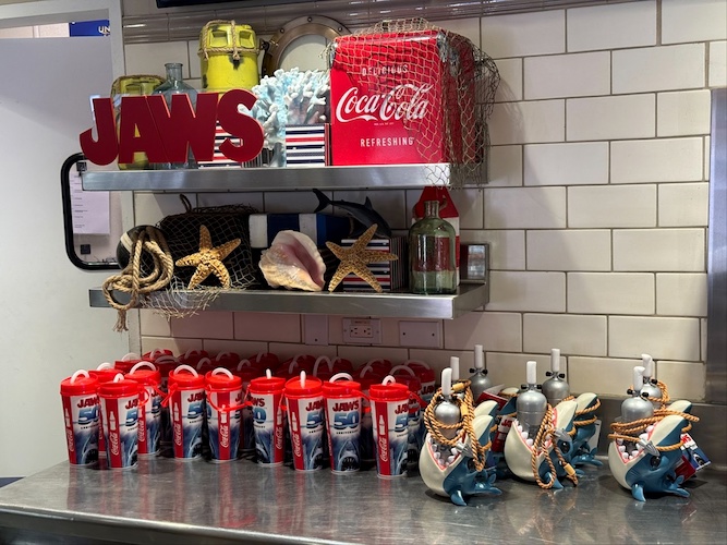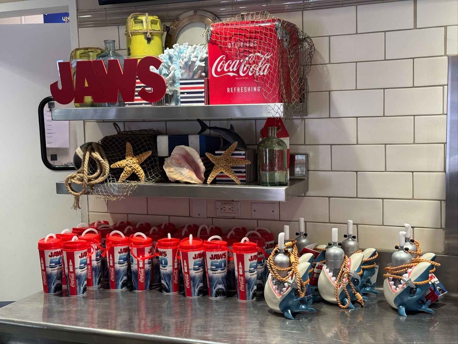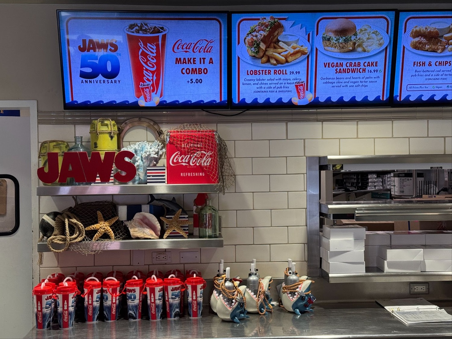 Inside the counter-service restaurant, we find still photos from Jaws and a poster honoring the movie’s 50th anniversary. Also behind the counter you can spot some minor Amity Island theming as well as the Jaws collectible cups and sippers available at the park during Mega Movie Summer.