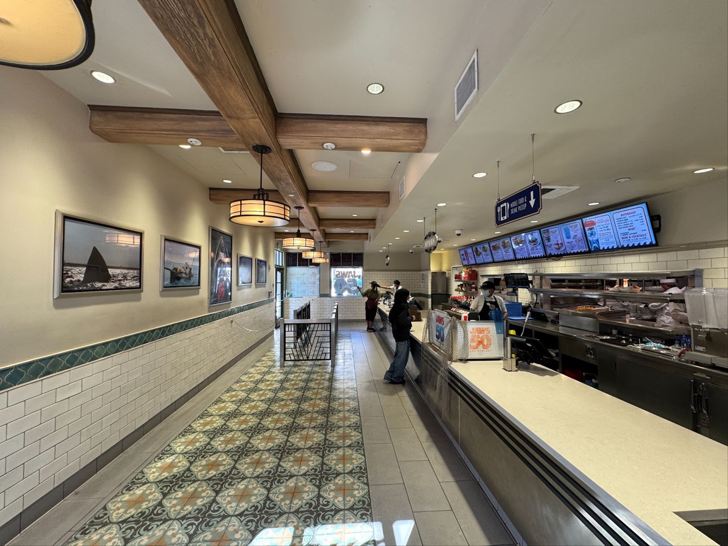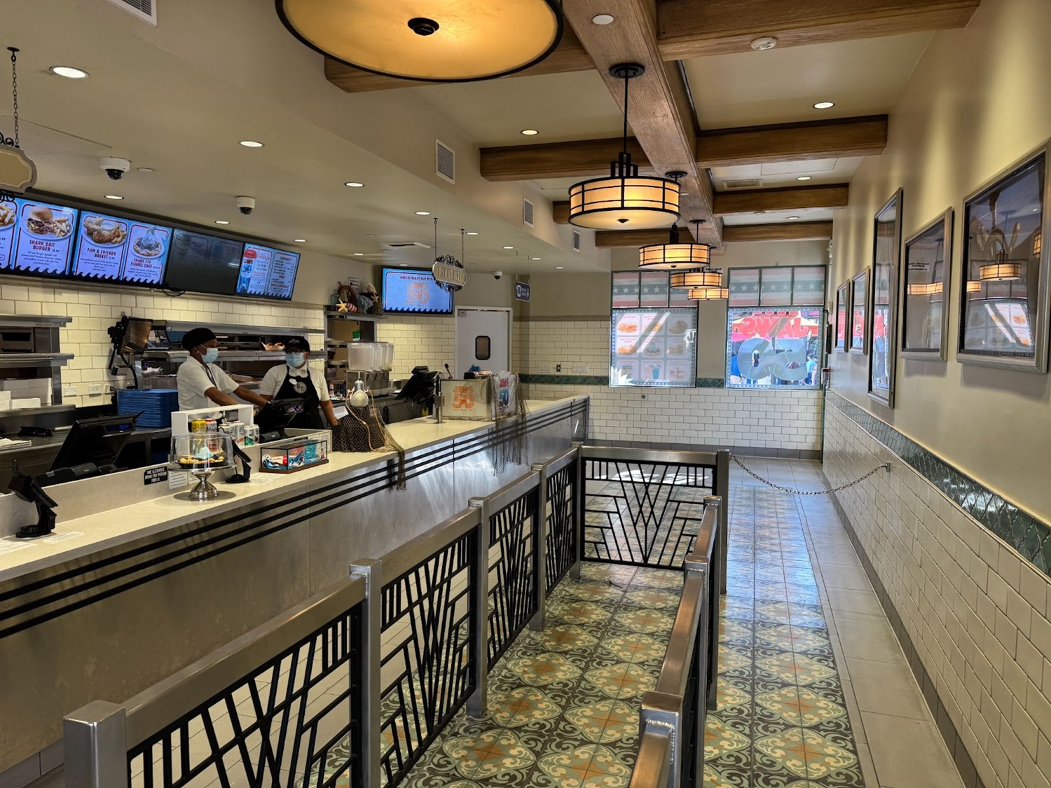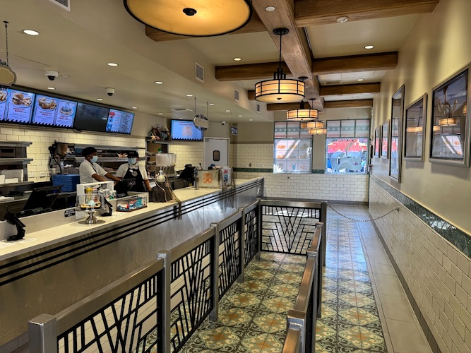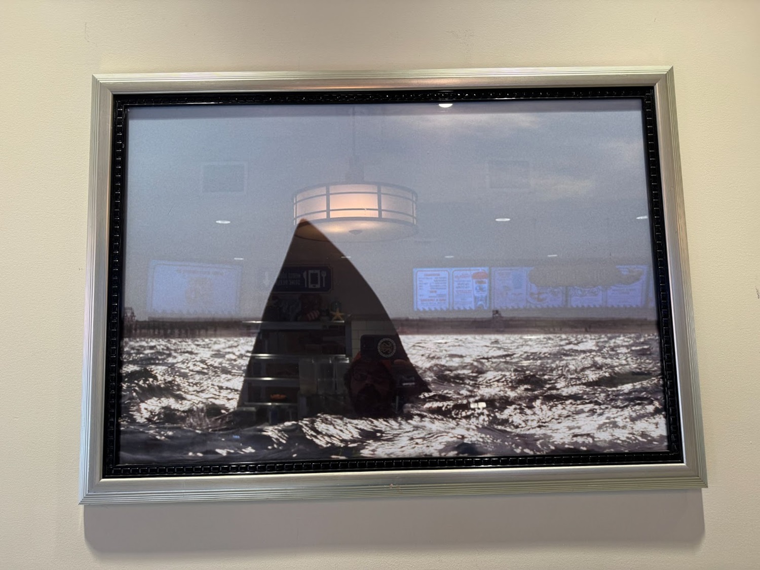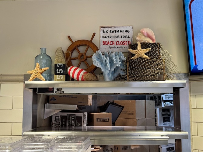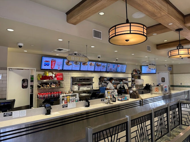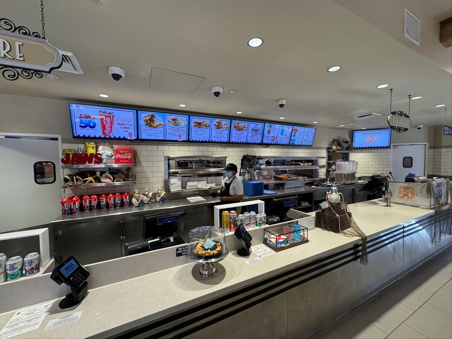 Inside the counter-service restaurant, we find still photos from Jaws and a poster honoring the movie’s 50th anniversary. Also behind the counter you can spot some minor Amity Island theming as well as the Jaws collectible cups and sippers available at the park during Mega Movie Summer.