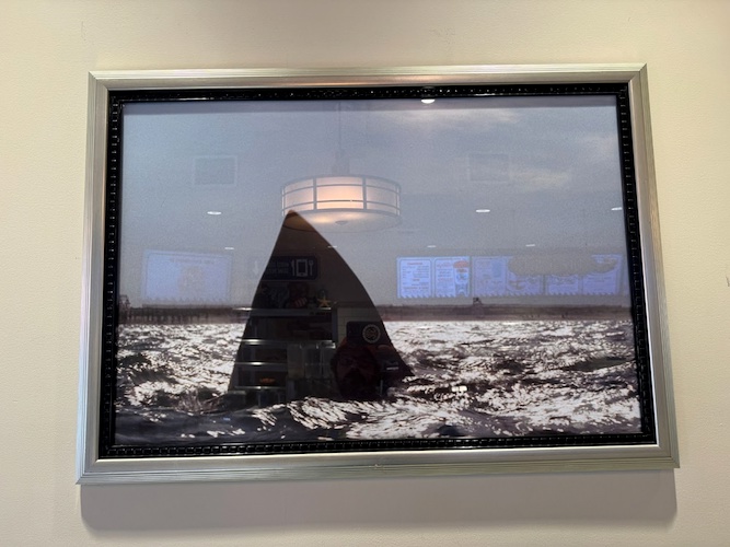 On the sides of the building’s exteriors are more signage celebrating Jaws’s 50th anniversary and promoting the restaurant overlay’s menu.