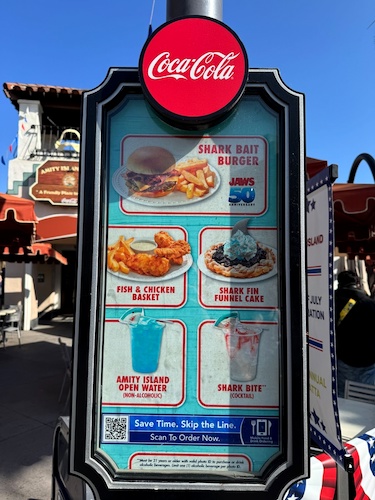 Additional items advertised on banners outside the dining location include the Shark Bait Burger, Fish & Chicken Basket, Shark Fin Funnel Cake, the non-alcoholic drink called Amity Island Open Water, and the alcoholic cocktail called the Shark Bite.