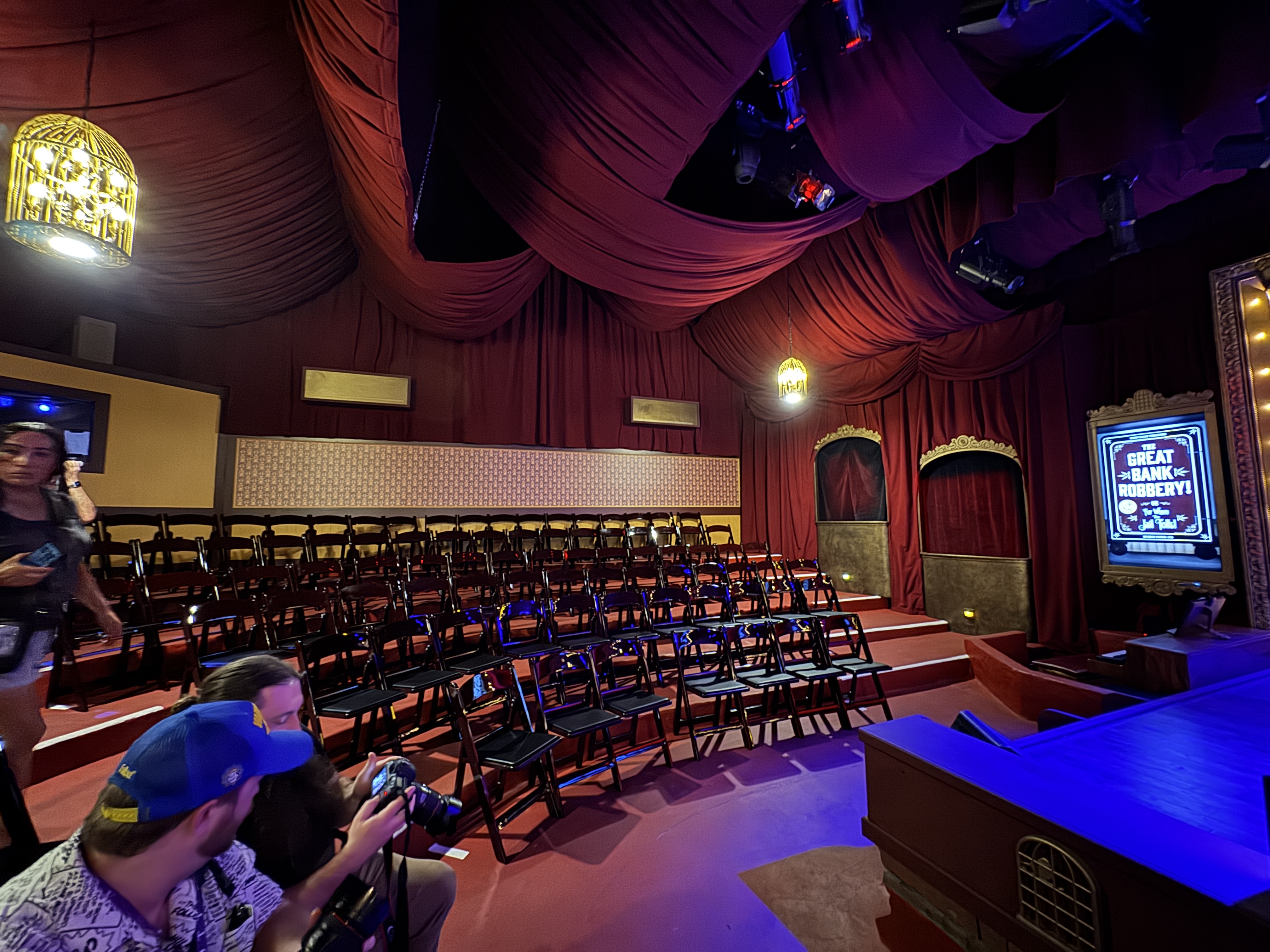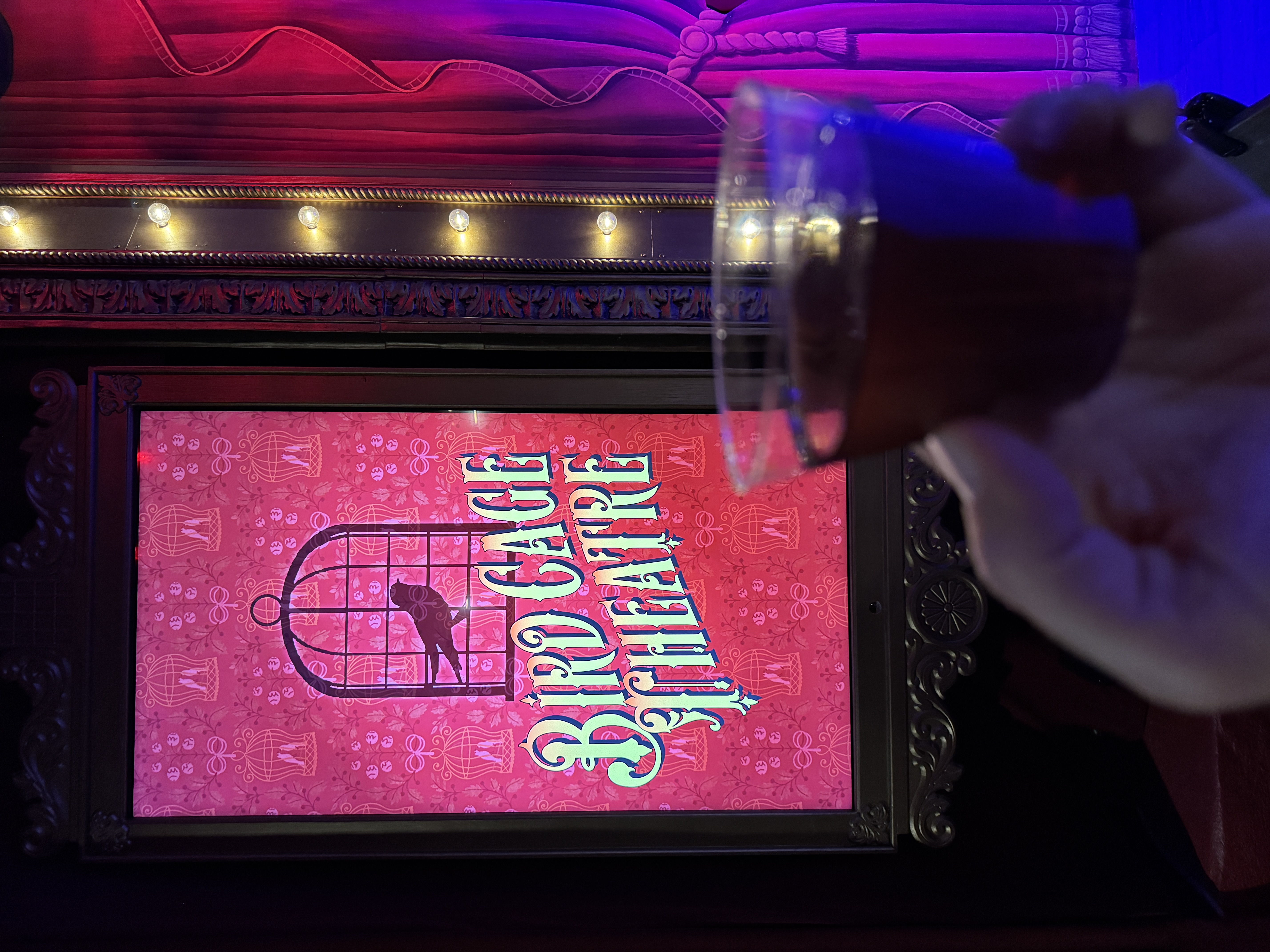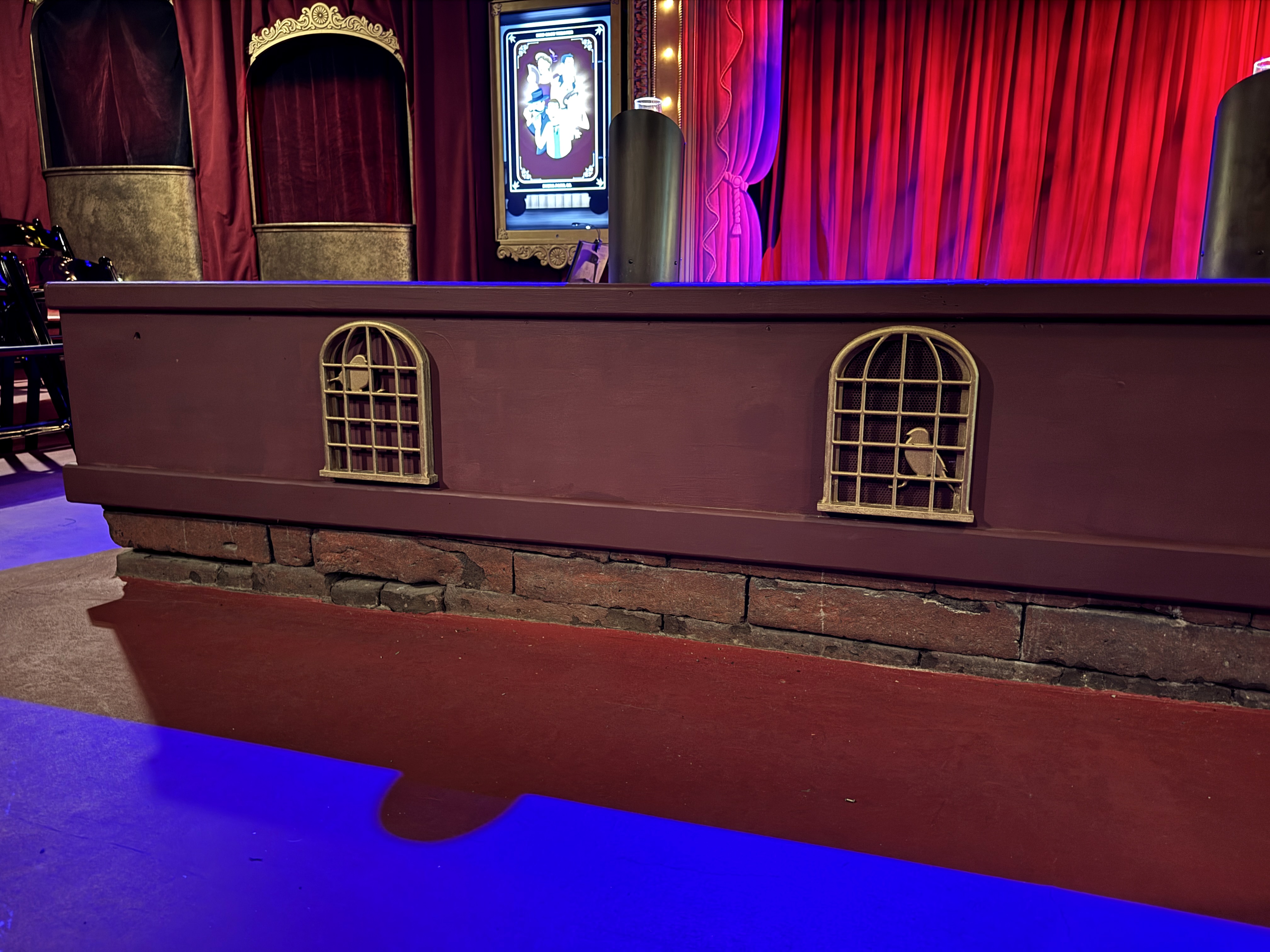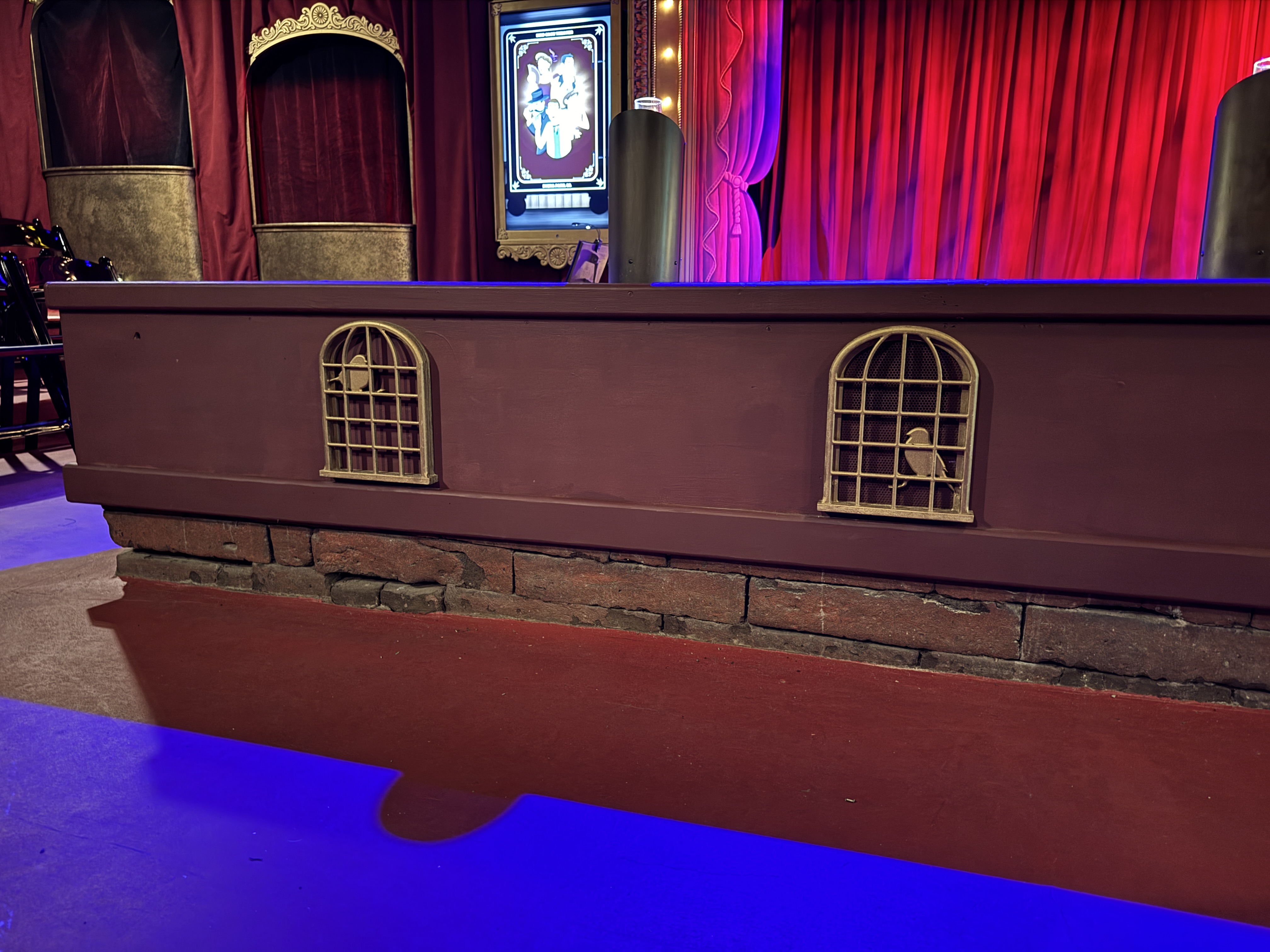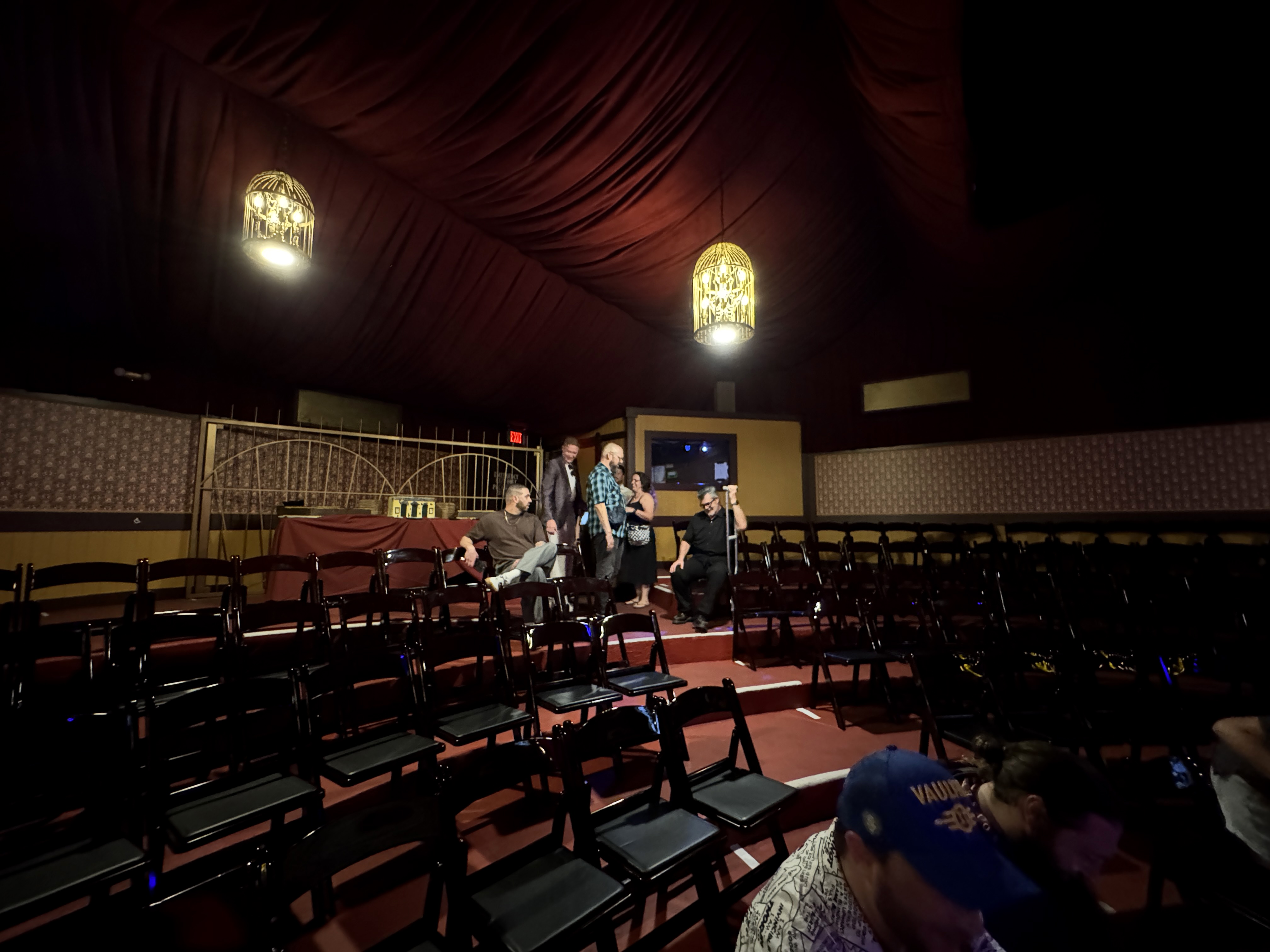 - Then it was time to move on into the theater's auditorium area, which is where the beautiful renovation really began to speak for itself. I found new wallpaper (modeled after the venue's original wallpaper), birdcage-themed light fixtures, a new red curtained ceiling, and more very impressive details all around.