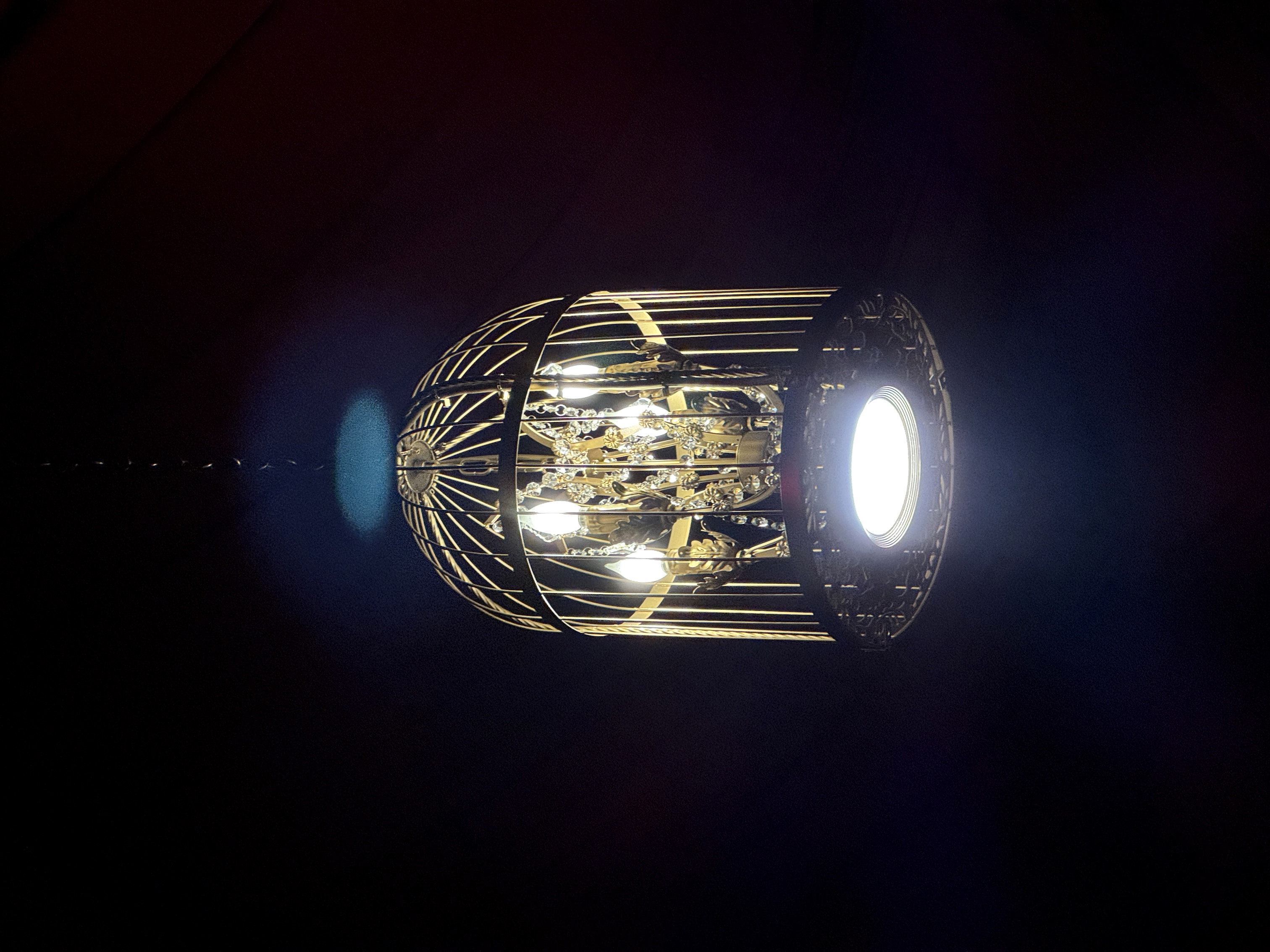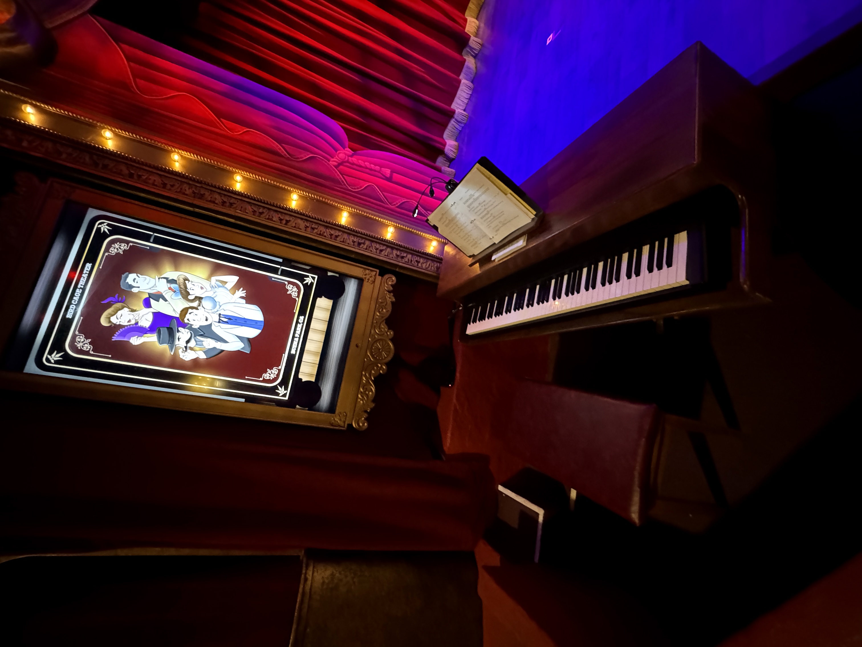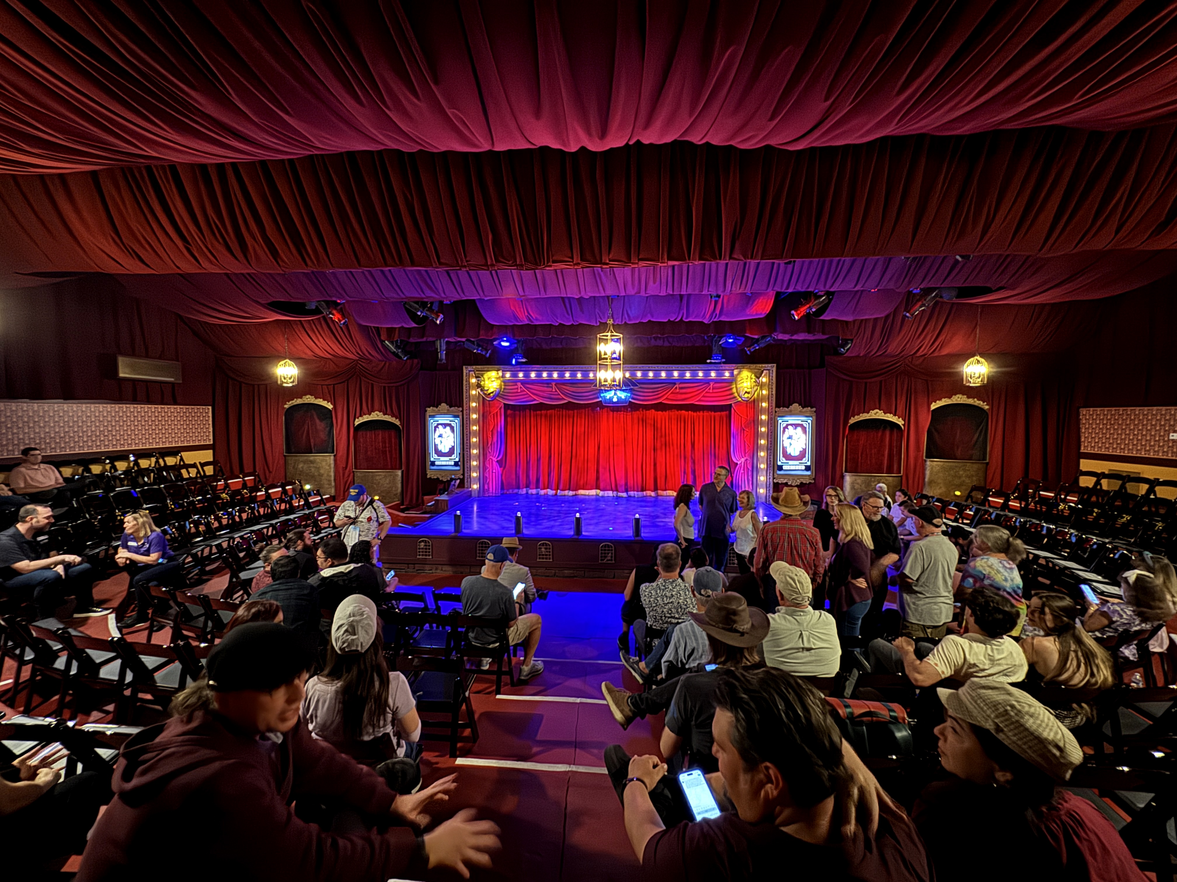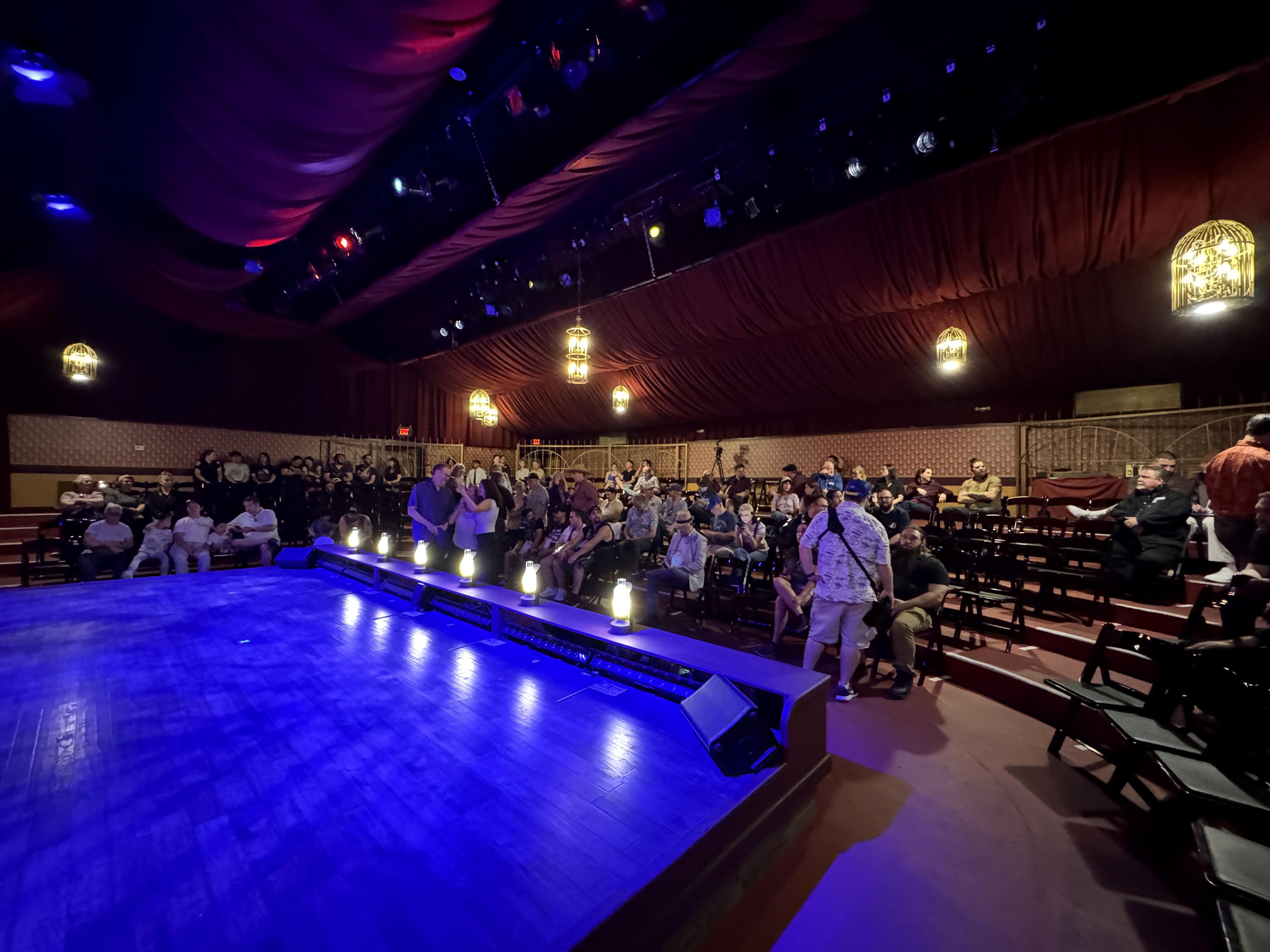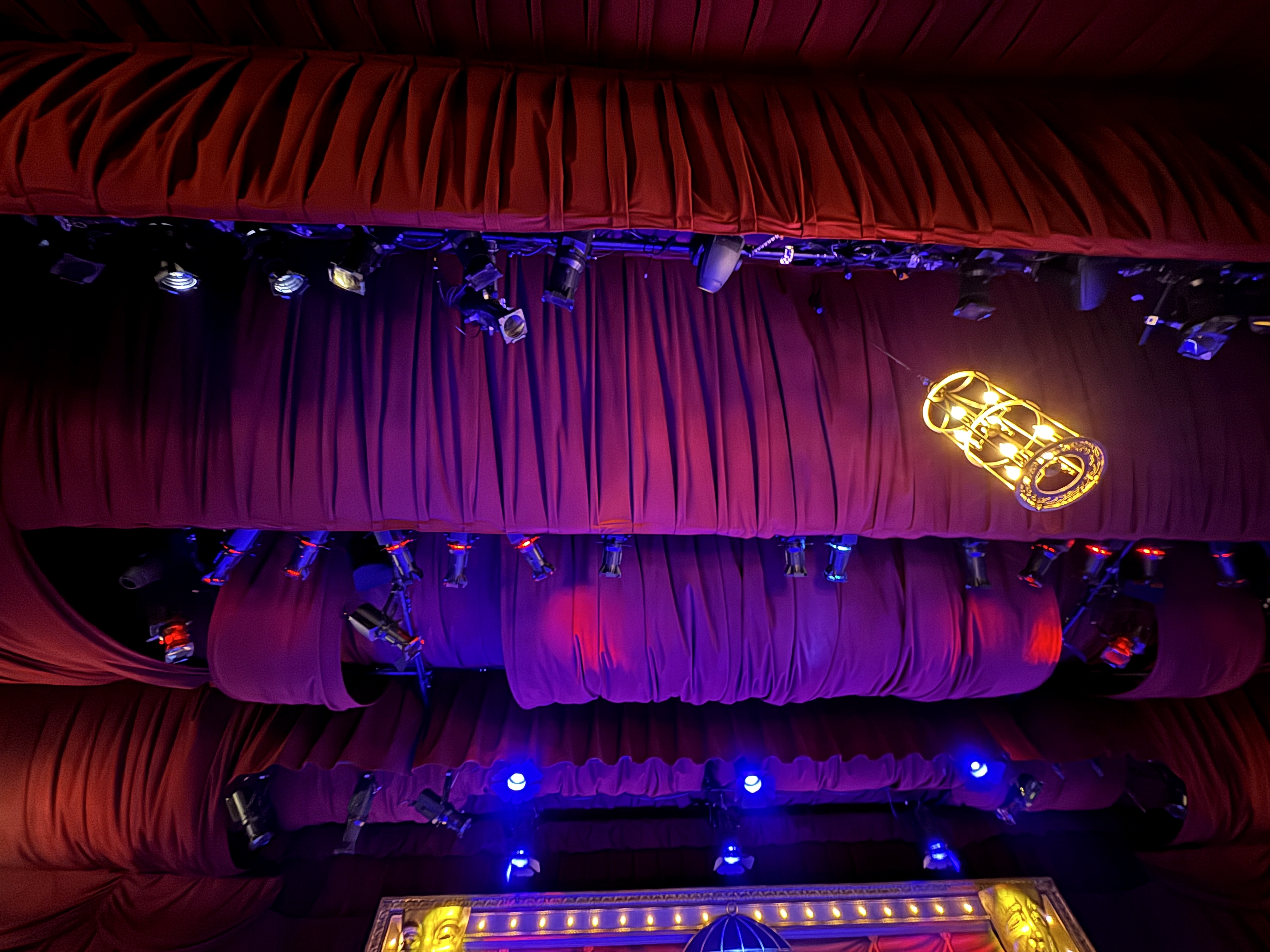- Then it was time to move on into the theater's auditorium area, which is where the beautiful renovation really began to speak for itself. I found new wallpaper (modeled after the venue's original wallpaper), birdcage-themed light fixtures, a new red curtained ceiling, and more very impressive details all around.