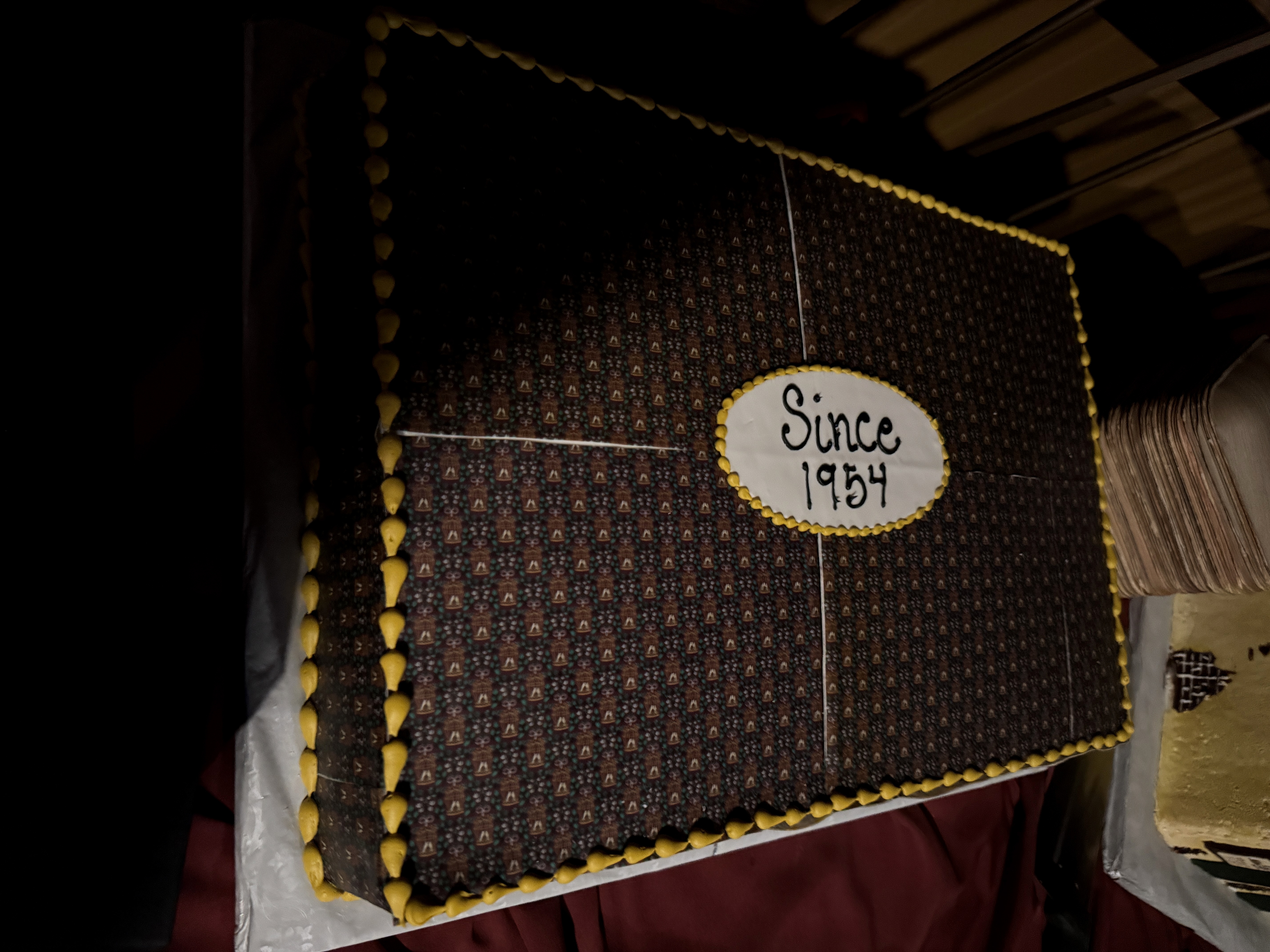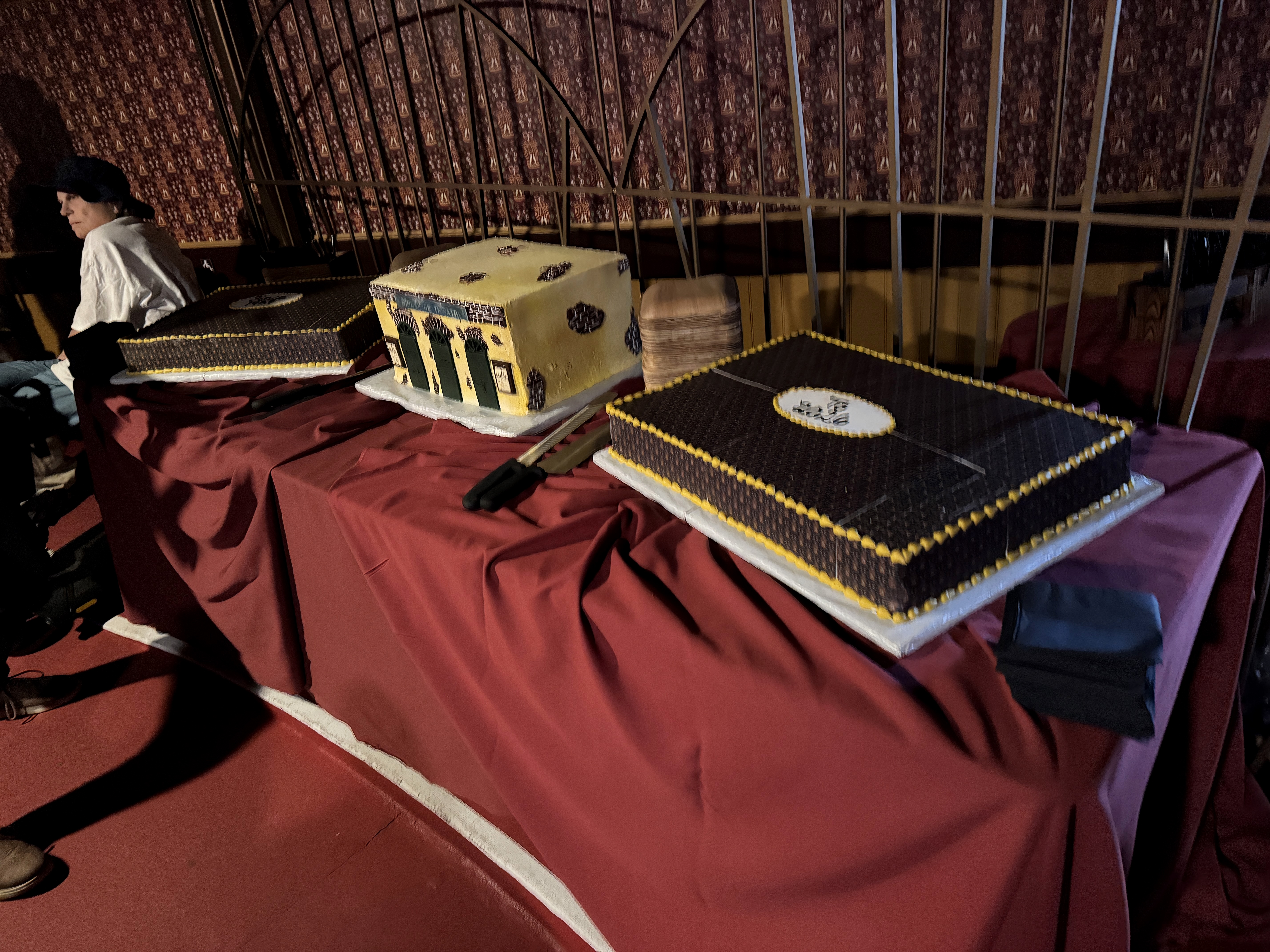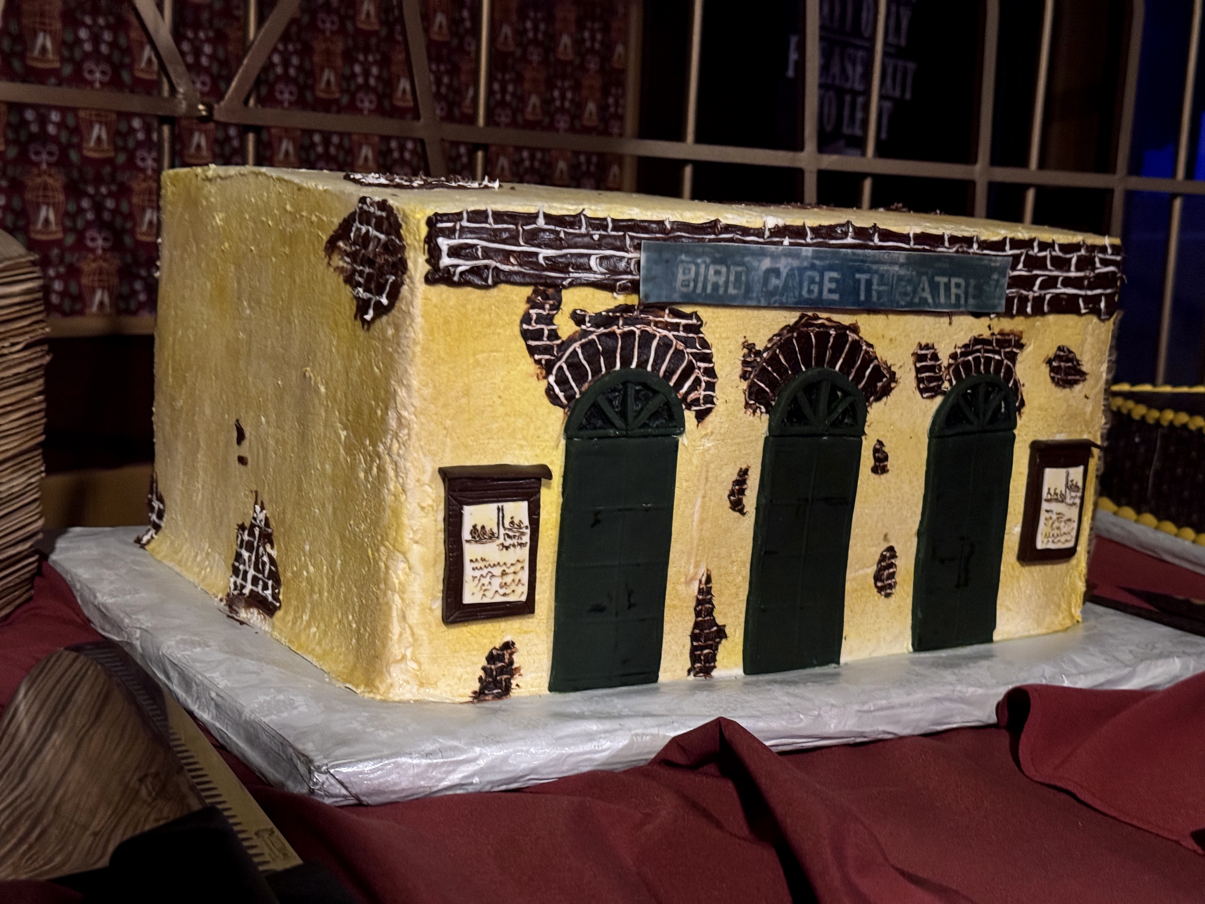 - As you saw in the panel discussion video above, the Bird Cage's reopening was celebrated with three cakes: two that featured the same pattern as the old/new wallpaper, and one that was shaped and decorated to resemble the location's instantly recognizable facade. Super neat! The event wrapped up with a toast-- using boysenberry champagne, naturally-- to seven more decades of the Bird Cage Theatre.