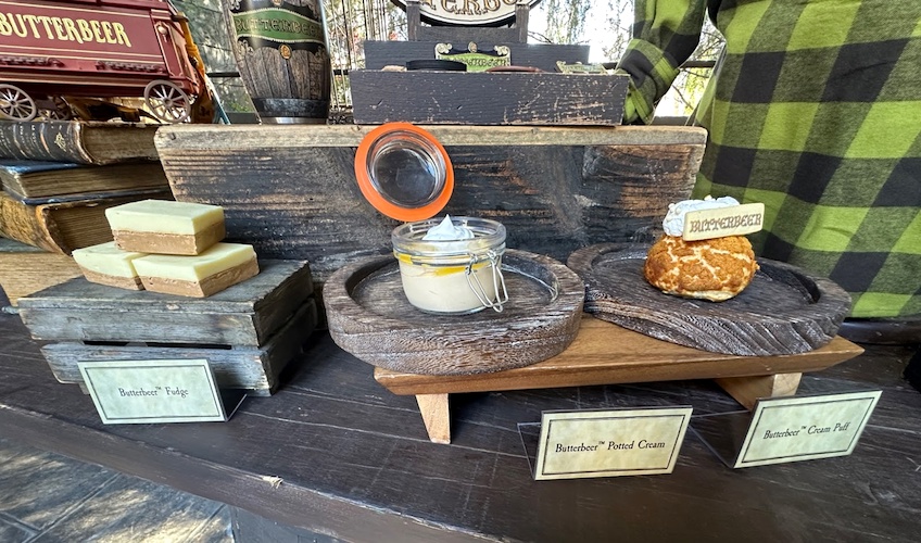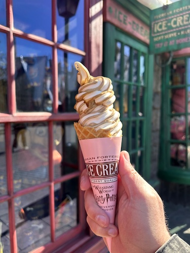 But my main purpose today was to try some Butterbeer treats! And there were quite a few to try, which made me grateful that I went there on a pretty empty stomach, though I probably now have more than enough sugar intake to cover me for the next couple of days. Besides the usual options for Butterbeer as a drink – regular, frozen or hot – plus the ongoing soft serve Butterbeer Ice Cream, as seen below, several other options are available during Butterbeer Season. And if you’re a big fan of the taste of Butterbeer, as I am, that makes for a lot of different ways you can enjoy it.