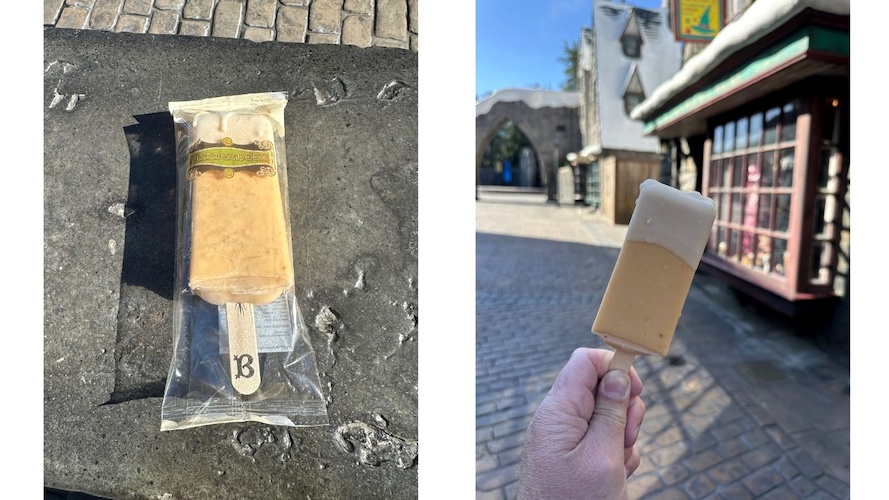 Also returning as part of Butterbeer Season is the Butterbeer Ice Lolly frozen dessert, which will be sticking around as a year-round item now, available at one of the outdoor food carts. This is actually the one Butterbeer food item that feels too subdued for me though. The coating has a decent Butterbeer taste to it, but it’s notably slight when paired with the actual ice lolly, which barely has any flavor to it at all, and certainly doesn’t taste like Butterbeer. With the lolly itself dominating, it feels lacking compared to the other options.