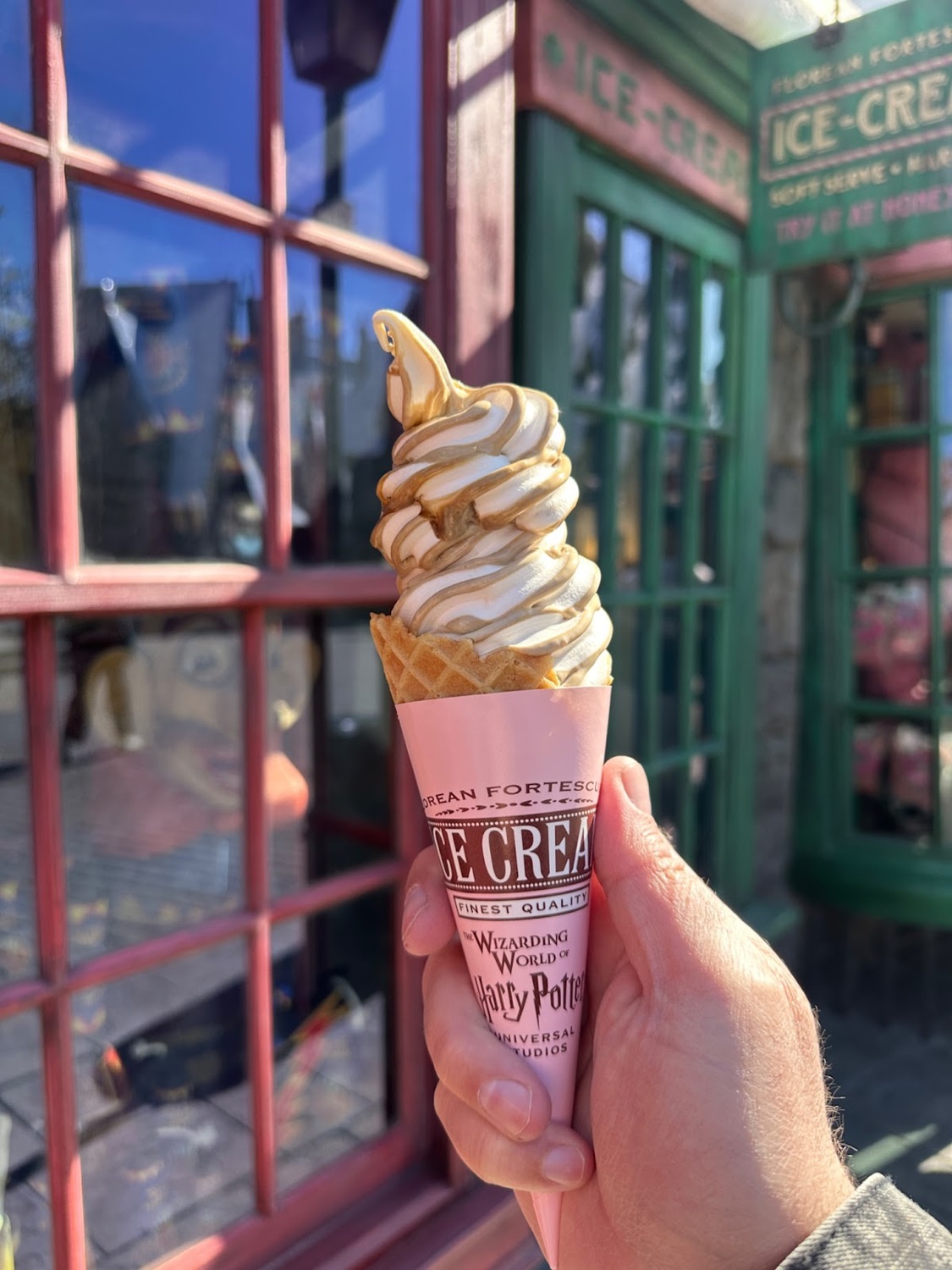 But my main purpose today was to try some Butterbeer treats! And there were quite a few to try, which made me grateful that I went there on a pretty empty stomach, though I probably now have more than enough sugar intake to cover me for the next couple of days. Besides the usual options for Butterbeer as a drink – regular, frozen or hot – plus the ongoing soft serve Butterbeer Ice Cream, as seen below, several other options are available during Butterbeer Season. And if you’re a big fan of the taste of Butterbeer, as I am, that makes for a lot of different ways you can enjoy it.