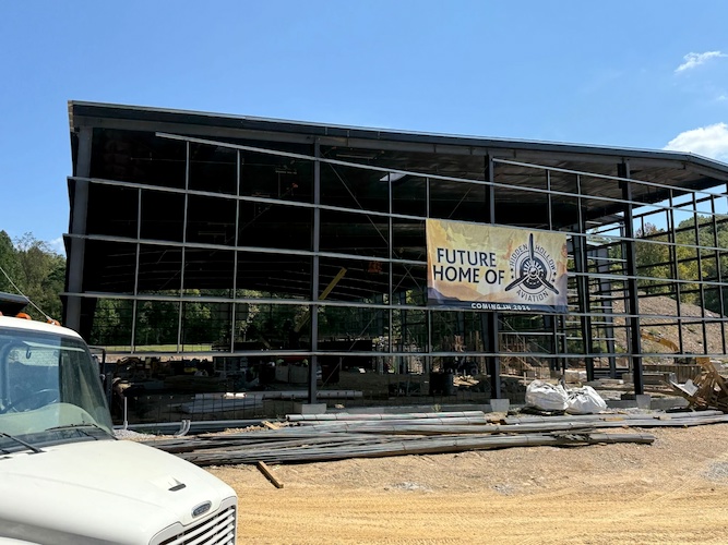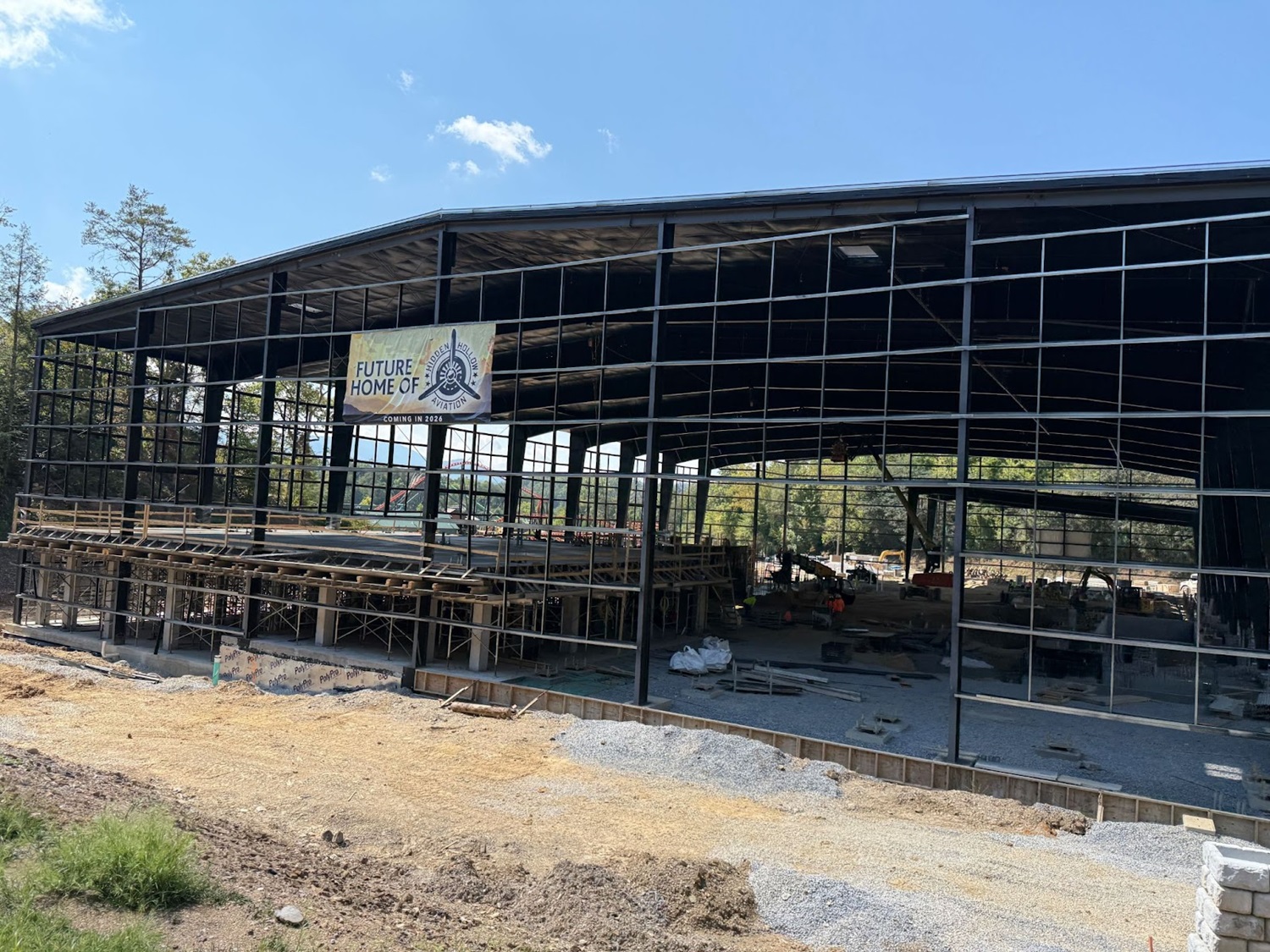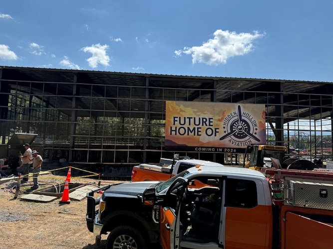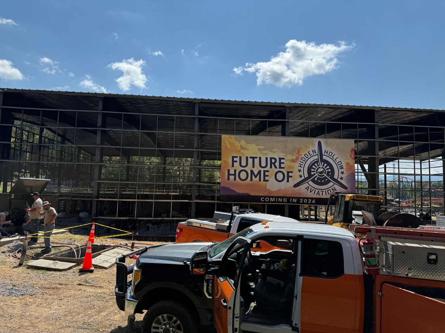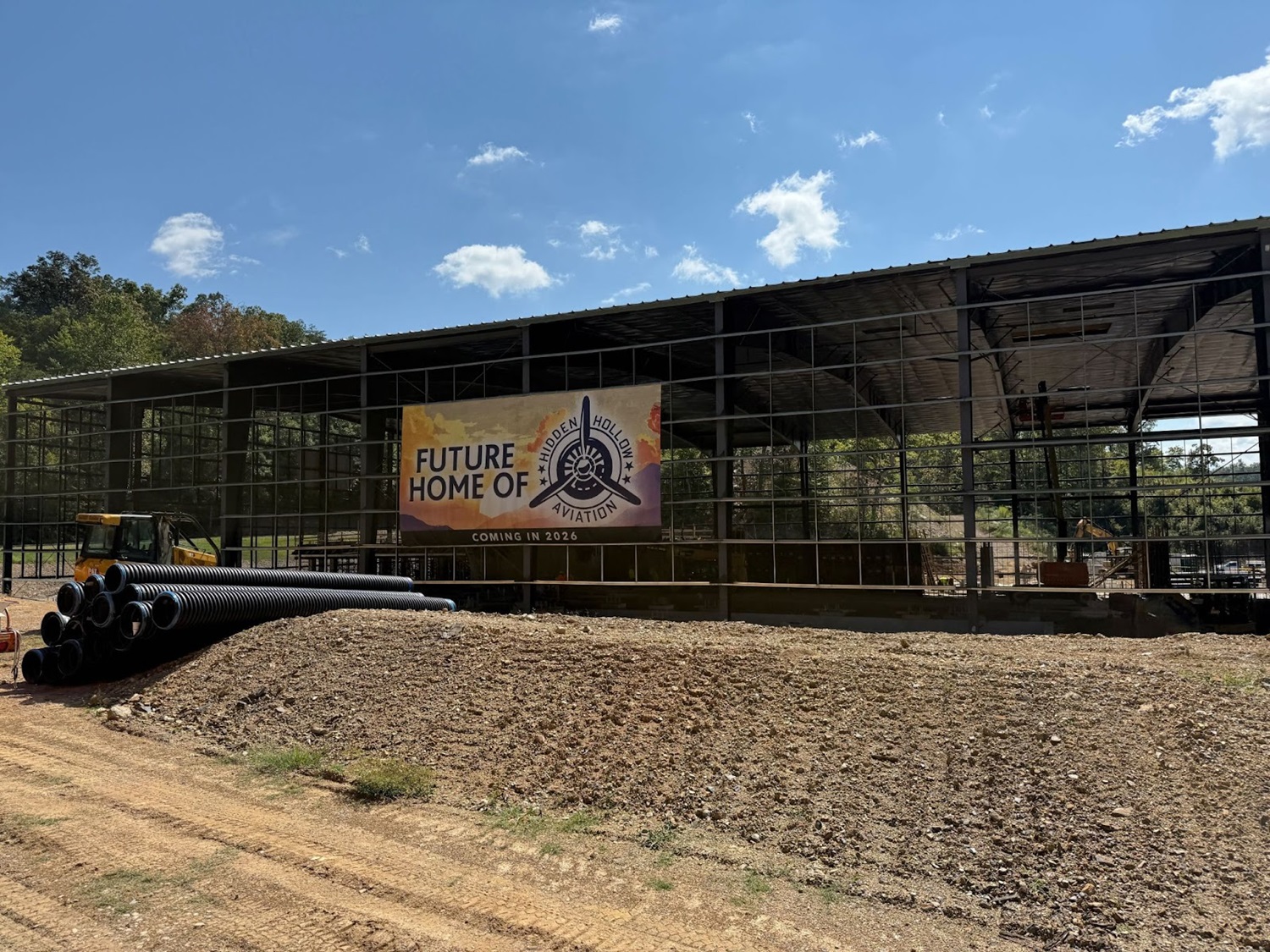A banner on the side of the building helps set the story, revealing that the building will soon be the future home of Hidden Hollow Aviation