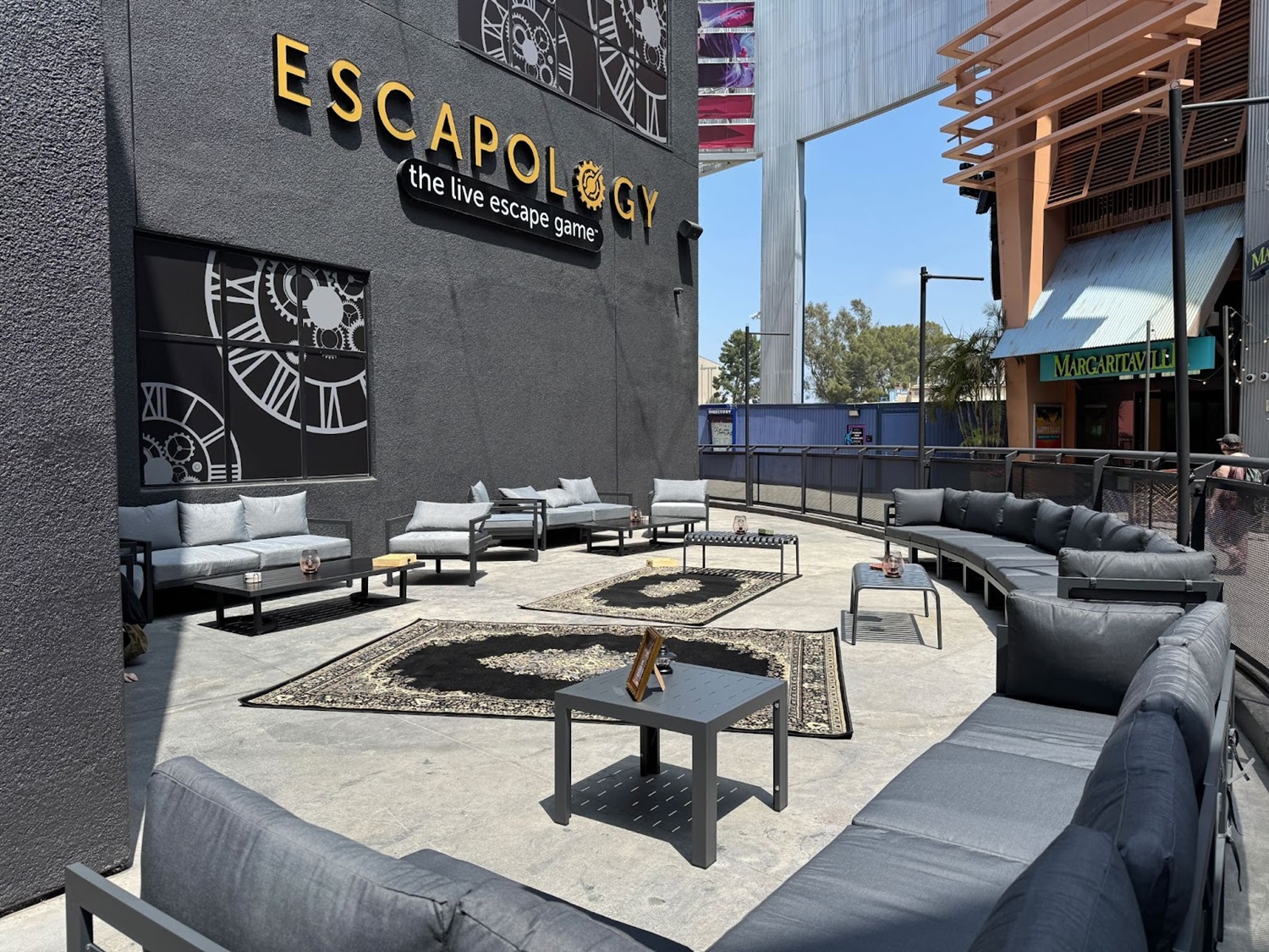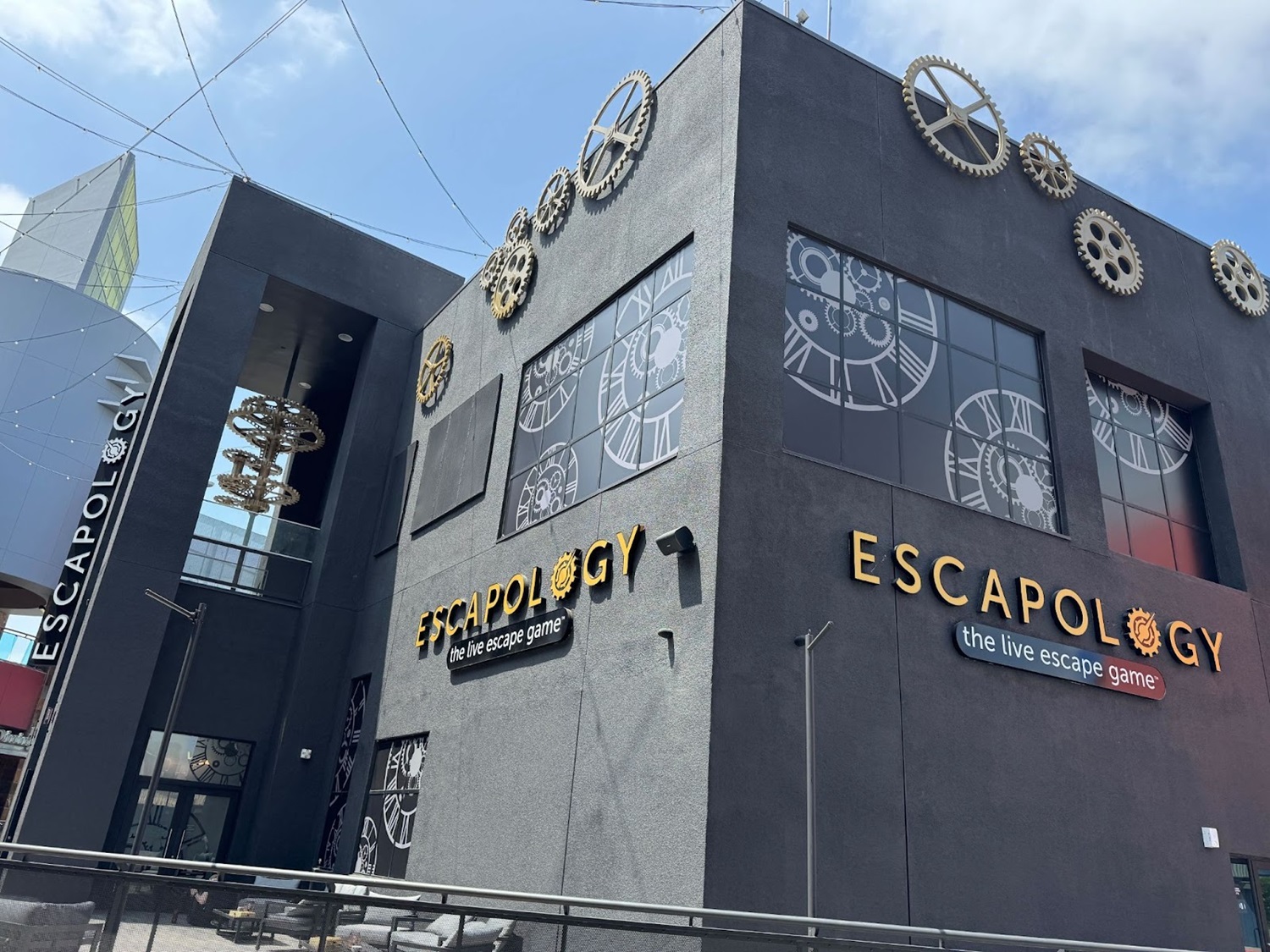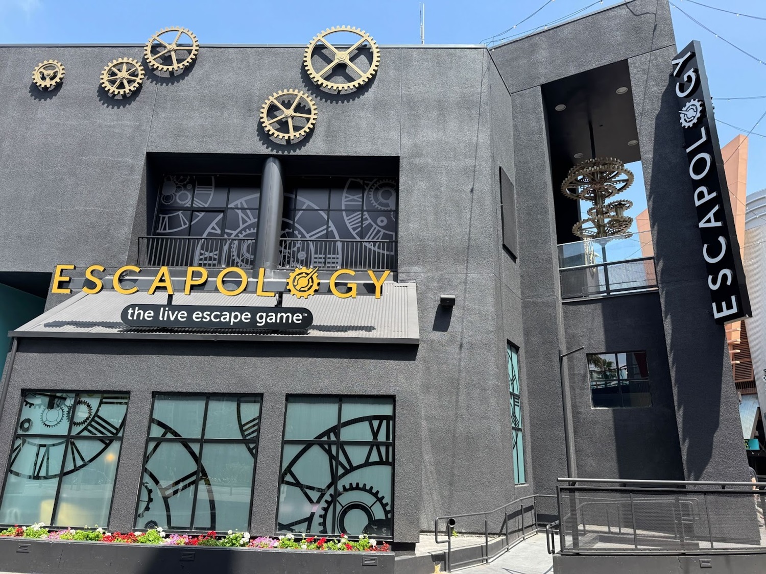 While it has undergone a soft opening for a short time, Escapology CityWalk Los Angeles officially opened as of today and is located behind Toothsome Chocolate Emporium & Savory Feast Kitchen (across from Jimmy Buffet’s Margaritaville and Buca di Beppo restaurants) at Universal CityWalk. I found that the building’s clockwork decor was a good match for Toothsome around the corner. There’s also an outdoor patio seating area at the venue.